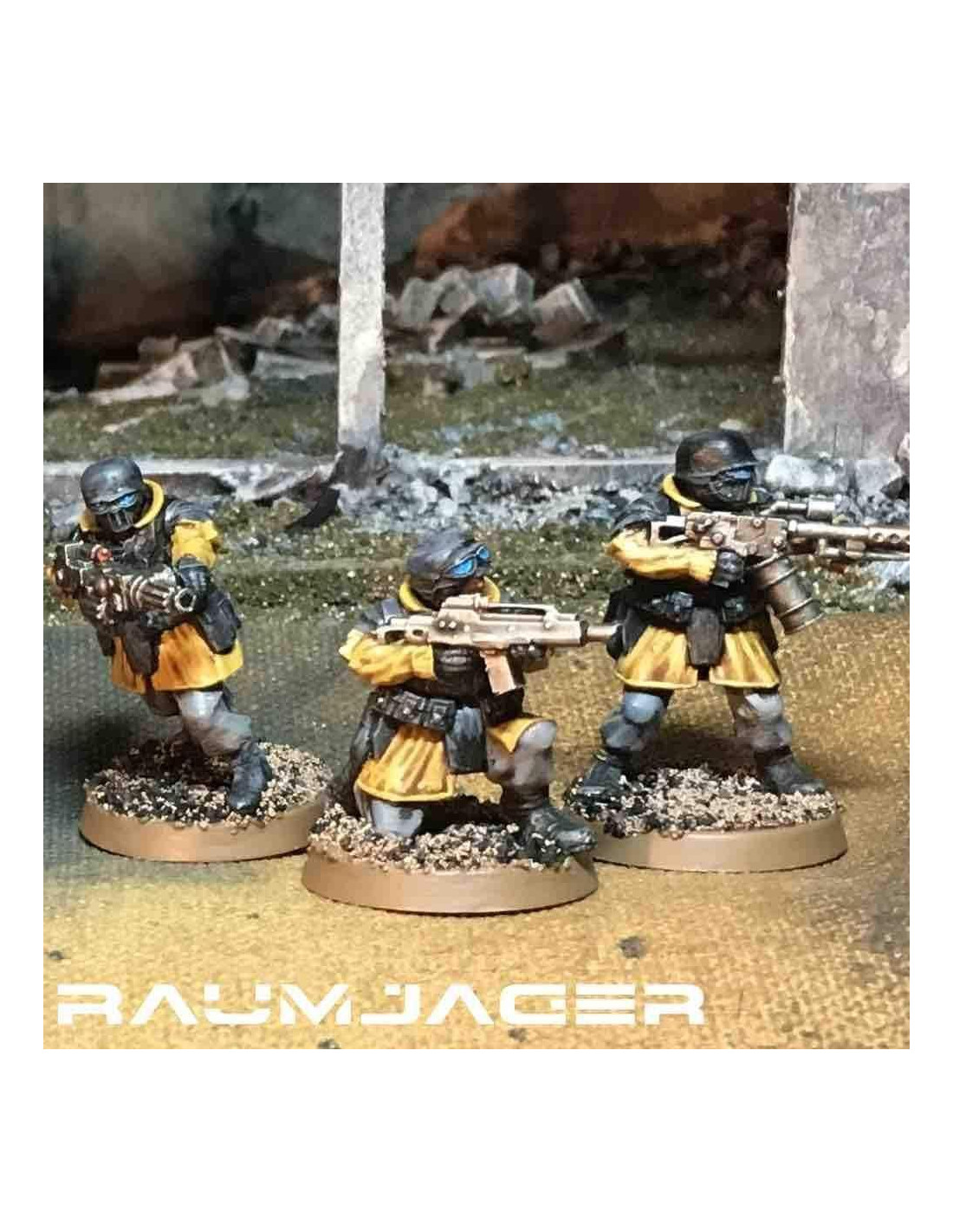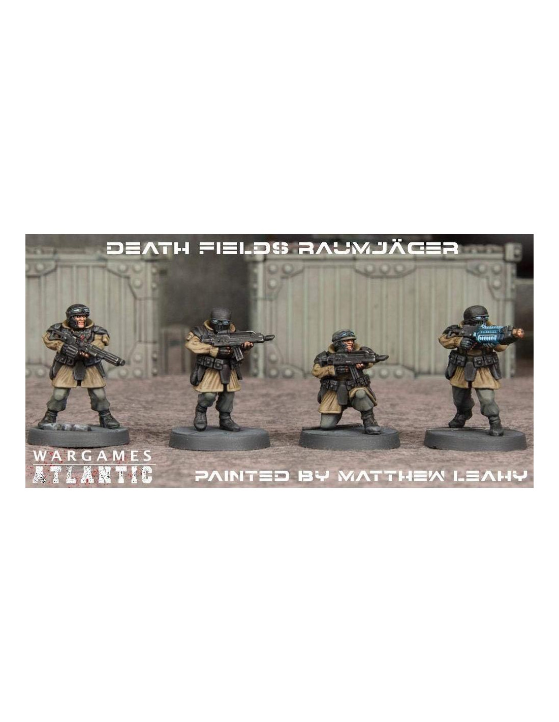 Incluso antes de convertirse en los famosos Raumjager del circuito de Campos de Muerte, este grupo de guerreros humanos era una unidad de paracaidistas alemana de élite - los Fallschirmjger. Un momento estaban tratando de frenar el avance aliado cerca de Carentan, al siguiente se encontraron a años luz de la Tierra - prisioneros de seres fantásticos con tecnologías aún más fantásticas. Los hombres del Regimiento Fallschirmjger 6, 7 Compañía habían sido llevados, como muchos de los mejores guerreros antes que ellos, a convertirse en gladiadores en el mayor deporte de la galaxia: el deporte de la guerra. Este conjunto de caja de plástico duro incluye suficientes piezas para construir 24 infantería y presenta rifles láser estándar, ametralladoras pesadas, lanzallamas y armas de plasma avanzadas.
