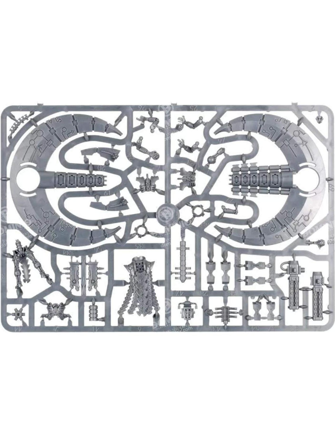 - conjunto de caja de plástico de múltiples partes contiene 84 componentes, dos tallos voladores pequeños, una base voladora grande, una base redonda de 25mm y dos hojas de transferencia Necron.