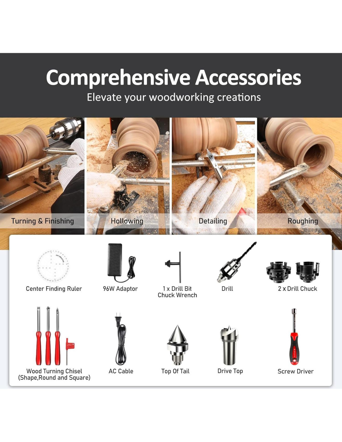 - Operación simplificada: el Torno para Tornear Madera ArtyMaster ofrece control de velocidad infinitamente variable para satisfacer diferentes requisitos de velocidad de corte, permitiendo a los usuarios cortar sin esfuerzo a través de varios materiales. La posición ajustable, altura, ángulo y longitud estacionaria del soporte de herramientas proporcionan un control preciso, mejorando la eficiencia y calidad de procesamiento para una amplia gama de proyectos de carpintería.