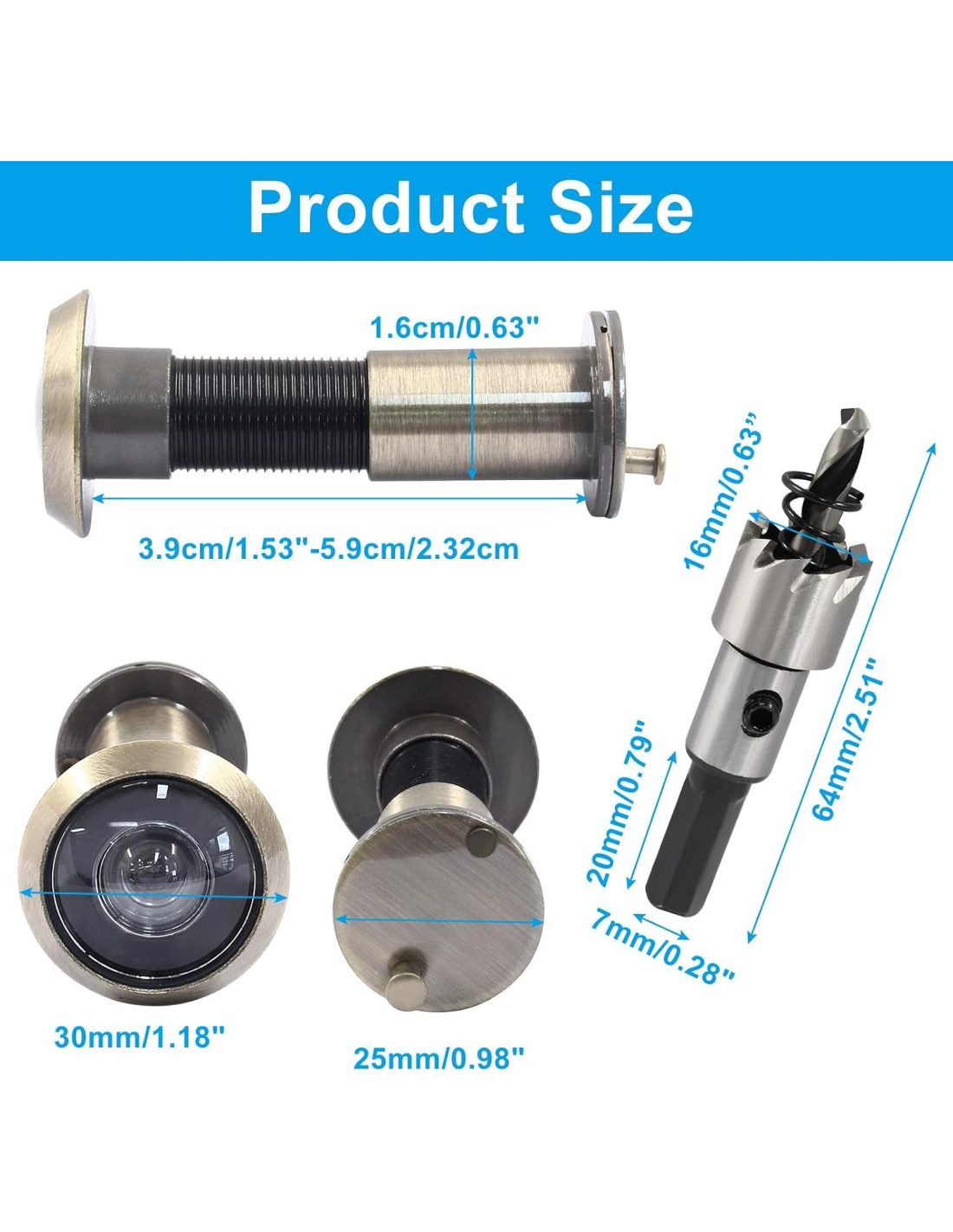 - El paquete contiene: 1 pieza de mirilla de puerta y 1 pieza de broca. Longitud ajustable de la mirilla de puerta: 3.9cm (1.53") - 5.9cm (2.32cm), diámetro de la broca: 1.6cm (0.63"), adecuado para puertas con grosores que varían de 3.49cm (1-3/8") a 5.08cm (2-1/6").
