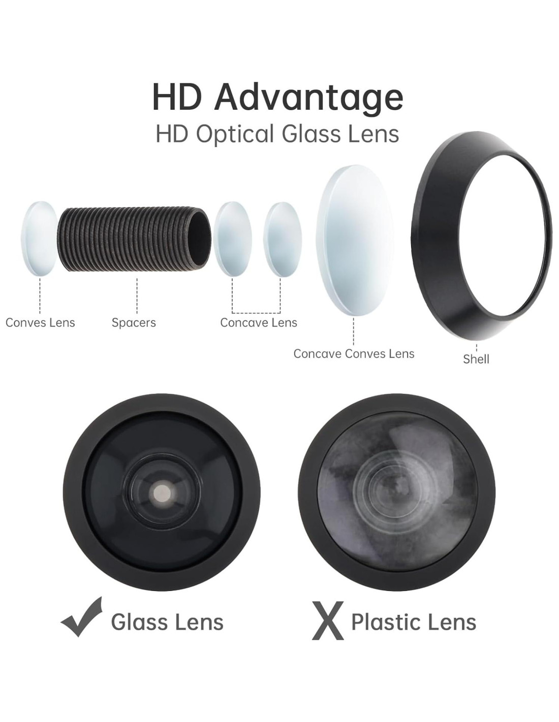 - Lente HD: Lente de vidrio óptico HD ofrece una vista cristalina de 180 grados y cobertura de ángulo super amplio. Puedes ver toda el área circundante desde la parte superior de la cabeza hasta los pies de alguien que está afuera. La mirilla de la puerta ofrece la más alta calidad de seguridad para ti y tu familia.