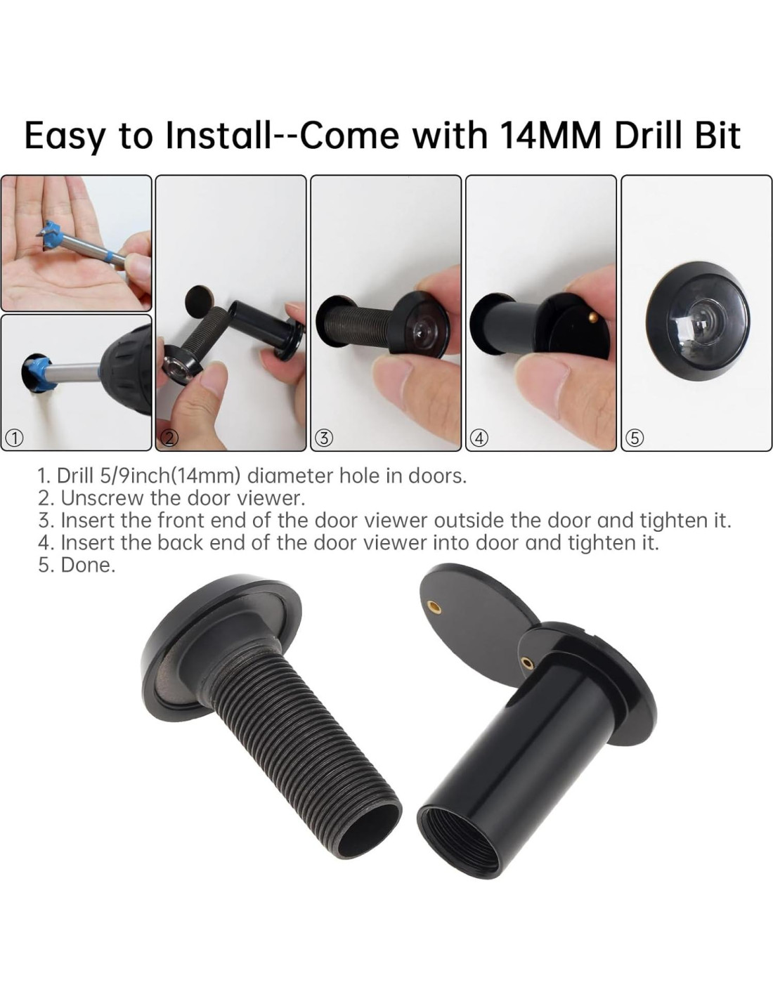 - Fácil Instalación: Viene con broca de 14 mm (5/9 pulgadas), las mirillas de puerta son adecuadas para puertas con un grosor de 1-3/8" a 2-1/6". Perfora un agujero de 5/9" de diámetro en una posición adecuada, inserta la mirilla en el agujero y luego atornilla los dos lados juntos y aprieta a mano.
