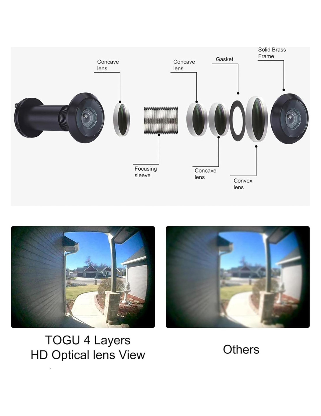 - Características especiales: Lente de vidrio óptico HD ofrece vista panorámica clara de 220 grados. Cubierta de privacidad de alta resistencia proporciona máxima privacidad y seguridad. Instalación sin complicaciones. Construcción de latón macizo que garantiza durabilidad de por vida. La garantía de por vida de TOGU siempre te pone primero.