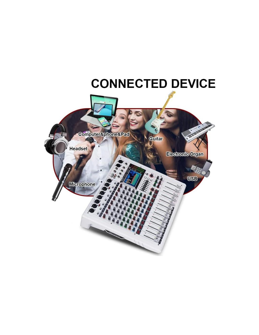 - 99 tipos de biblioteca de efectos DSP profesionales. Efectos de procesamiento de señal digital preestablecidos de 99 tipos incorporados, cambio rápido de escena, para satisfacer las necesidades de rendimiento diversificadas, adecuado para: actuaciones profesionales en escenario, actuaciones en vivo, mezcla de DJ, karaoke y actividades de fiesta