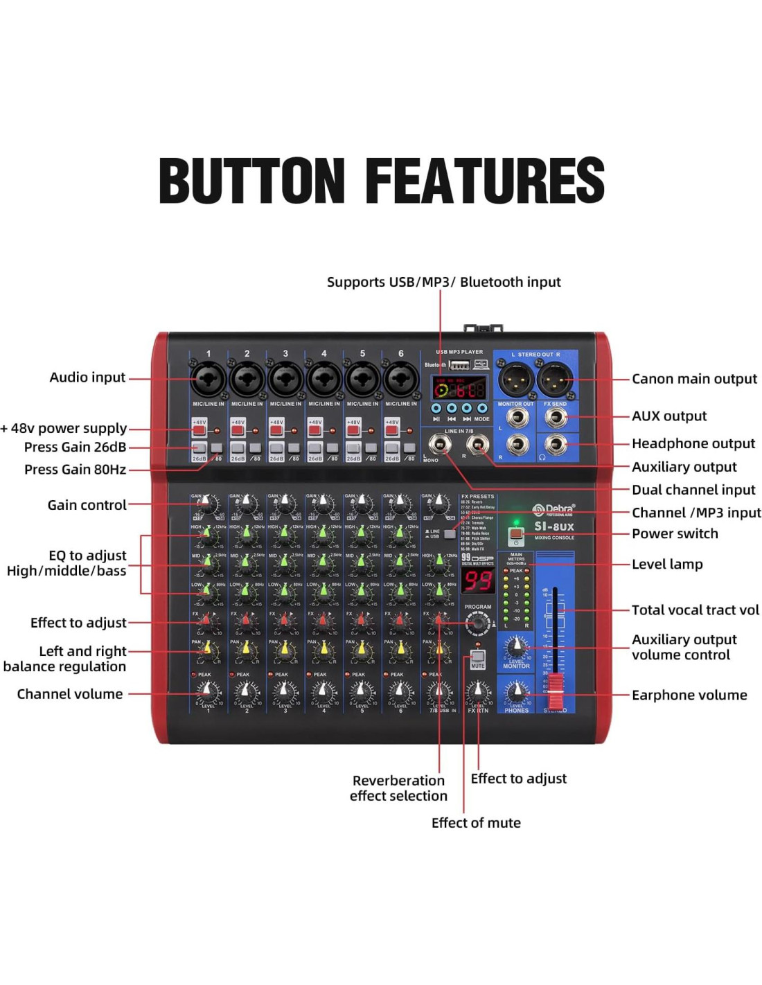 - Este mezclador personal tiene una tarjeta de sonido USB y una interfaz de audio para grabar y conectarse a MAC o PC y tiene compatibilidad universal con archivos de audio digital. Puede ser utilizado por principiantes o aplicaciones profesionales de estudio. 99 Efectos DSP, puede satisfacer la mayoría de los requisitos de grabación de escenas