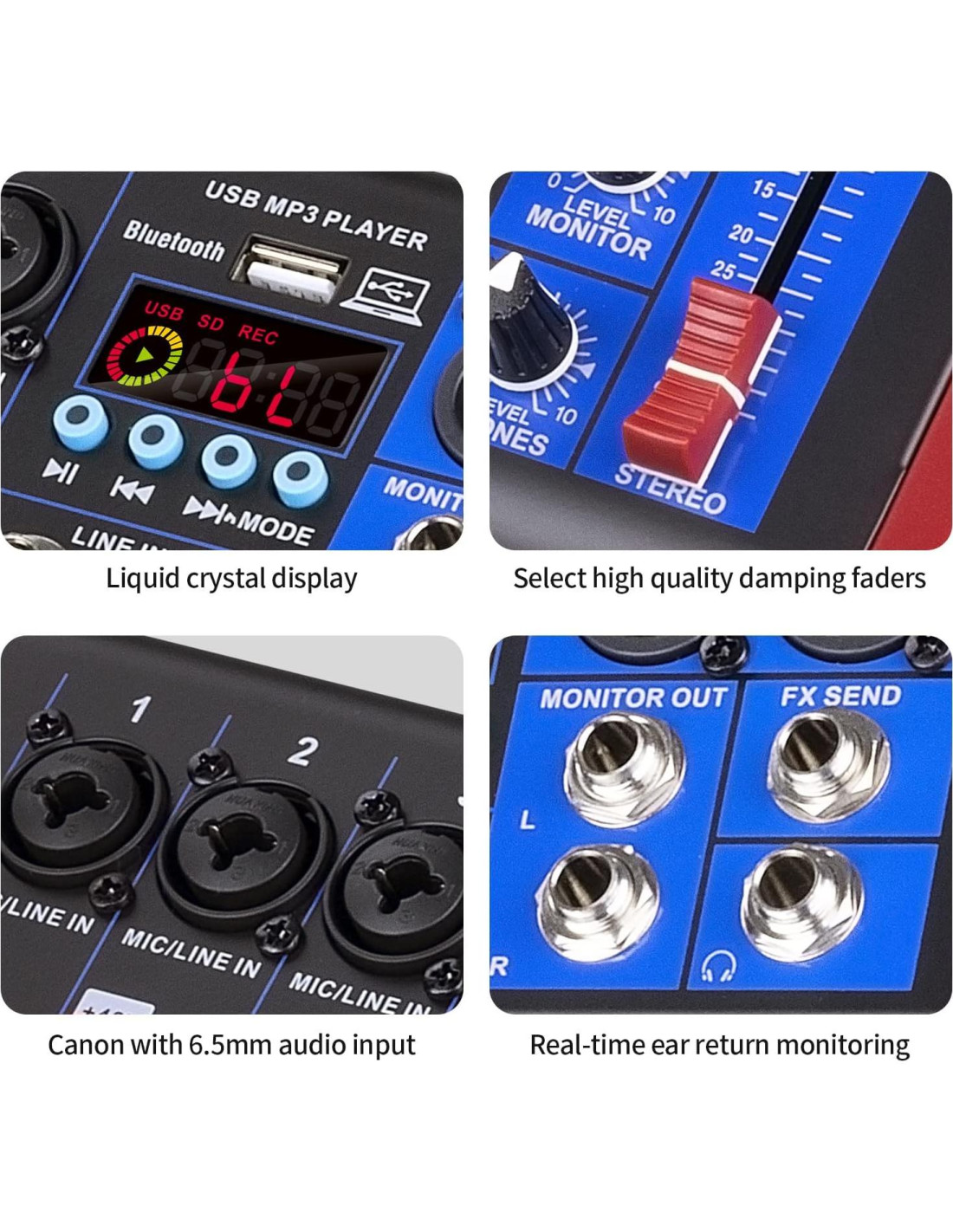 - El mezclador de grabación tiene luces indicadoras LED y perillas de ajuste rotativas para la conveniencia del usuario. Tiene selección de entrada, controles de volumen maestro, balance de canal independiente y ajuste de frecuencias altas, medias y bajas. Adecuado para diversas grabaciones de individuos, bandas y profesionales
