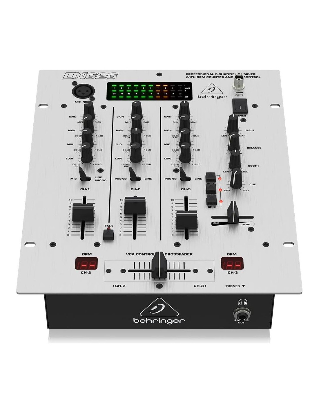 Descripción del Producto Mezclador DJ Profesional de 3 Canales con Contador de BPM Amazon.com El PRO MIXER DX626 es un mezclador DJ profesional de alta calidad de 3 canales con contador de Beats-Per-Minute (BPM) integrado, y encarna un diseño de 3 canales probado y querido por DJs de todo el mundo, tanto principiantes como profesionales. Su crossfader de doble riel "Ultraglide" super suave con hasta 500,000 ciclos de vida garantiza años de diversión sin problemas. Mezclador DJ Profesional de 3 Canales con Contador de BPM y Control VCA. Haga clic para ampliar. Función de monitor con opción de mezcla master/PFL. Calcule sus tempos con contadores de BPM duales. Tres Entradas Estéreo El DX626 cuenta con tres canales estéreo de entrada dual con ganancia y ecualizador kill de 3 bandas (-32 dB). Los ecualizadores kill se pueden bajar a una extensión mucho mayor (-32 dB) de lo que se pueden subir (+12 dB), muy útil para desvanecer un rango de frecuencia de una pista musical u otras aplicaciones. El primer canal también se puede cambiar a entrada de micrófono ULN de calidad de estudio, para usar con la función de talkover manual. Contador de BPM El contador de BPM del PRO MIXER DX626 es una característica extremadamente útil. Asegura una transición suave de una pista a la siguiente, haciendo que su sesión sea un éxito absoluto. Puede calcular los diversos tempos de las pistas en bpm (beats por minuto). La pantalla izquierda indica el tempo en el canal 2 y la pantalla derecha muestra el tempo en el canal 3. Función de Monitor con Opción de Mezcla Master/PFL La señal PFL es la señal de sus auriculares. Le permite previsualizar música sin afectar la señal maestra. La señal del canal de auriculares se toma pre-fader (PFL=Pre-Fader Listening). Con los tres botones CH-1, CH-2 y CH-3, determina la fuente de señal para la señal de auriculares. Previsualice los canales individualmente o escuche los tres simultáneamente. Conector para Lámpara de Cuello de Ganso Conecte una lámpara BNC de 12 voltios disponible comercialmente y obtenga una mejor vista de su mesa, incluso en los conciertos más oscuros. Qué hay en la Caja Mezclador DJ Behringer DX626, Cable de Alimentación, Manual del Usuario