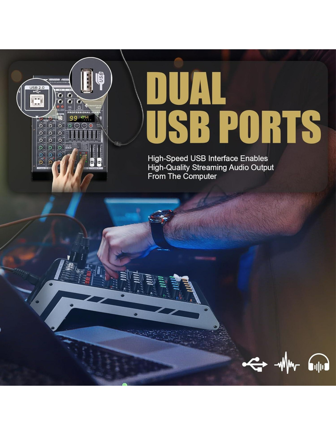 - CONFIGURACIÓN FÁCIL Y PUERTOS USB DOBLES: Consola de Mezcla de Uso Fácil con controles simplificados y diseño lógico para una configuración rápida, puertos USB dobles permiten grabación y reproducción simultánea de DAW + carga móvil ideal para sets de streaming de DJ o músicos tocando pistas de fondo. Gestiona software e entradas en vivo con cero latencia.