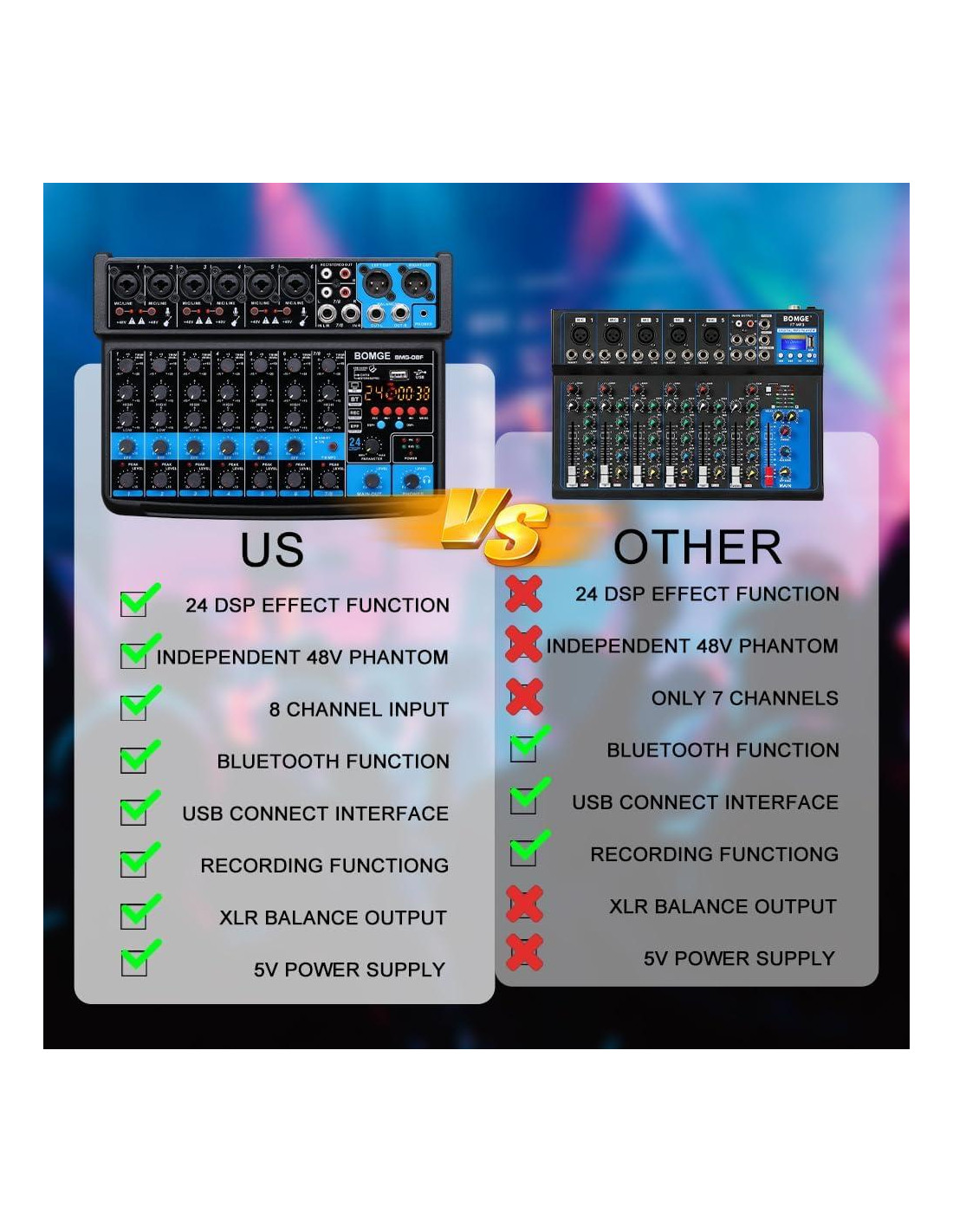 - Procesador de efectos de sonido DSP incorporado-Mezclador BOMGE de 8 canales Con 24 opciones de FX diferentes, desde reverberaciones hasta retrasos, agregar algo de drama a tu sonido es fácil... fácil... 1: Cambiador de voz 2: Sonido mágico 3: Voz de niño 4~10: Retraso 11~24: Eco+Retraso;