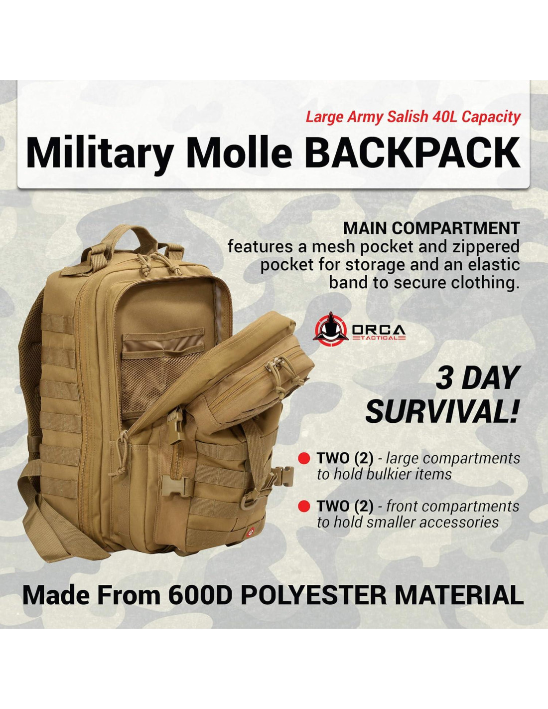 - [CONSTRUIDA FUERTE]: Nuestra mochila táctica negra está hecha de material de poliéster 600D. Las mochilas y paquetes tácticos ORCA están reforzadas y cosidas doblemente en todos los puntos de tensión. Los cierres están asegurados por cremalleras de alta calidad con tiradores de nylon que son resistentes a la corrosión y duraderos, y nuestro recubrimiento especial hace que nuestra mochila para hombres sea resistente al agua y a los arañazos.