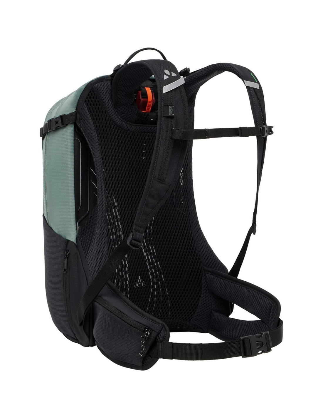 ¡Para un viaje espontáneo con la bicicleta de montaña! La mochila para bicicleta Trailvent de 15 litros es el compañero ideal. Impresiona no solo con su sistema de espalda Aeroflex 3D excelentemente ventilado, sino también con un alto confort de uso duradero, que se asegura gracias a la longitud de espalda ajustable infinitamente, así como a las correas de cadera y hombro bien acolchadas y la correa del pecho con soporte para tubo. La división de compartimentos bien pensada no deja nada que desear: en el gran compartimento principal hay un compartimento separado para una bolsa de hidratación y un bolsillo con cremallera para objetos de valor, así como un portaclaves. El gran bolsillo frontal puede contener bomba de aire, herramientas y manguera de repuesto. Las correas de compresión laterales en el tercio superior aseguran que el contenido de la mochila esté guardado de manera ordenada; los bolsillos exteriores de malla sostienen todo lo que necesita estar rápidamente a mano. Un soporte para casco y un soporte para luz intermitente son parte del equipo, así como los grandes elementos reflectantes y la cubierta de lluvia integrada. La mochila para bicicleta está equipada con Eco Finish libre de PFC, repelente al agua. La etiqueta VAUDE Green Shape representa un producto funcional y ecológico hecho de materiales sostenibles.