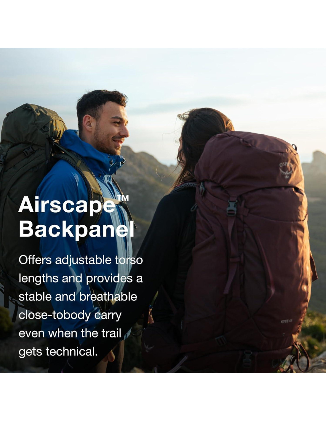 - Panel Trasero AirScape - Un panel trasero AirScape moldeado por inyección ofrece longitudes de torso ajustables y proporciona un transporte estable y transpirable cerca del cuerpo incluso cuando el sendero se vuelve técnico