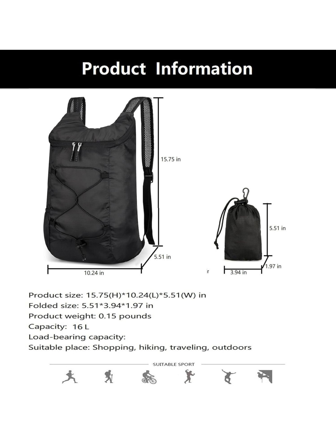 - LIGERA Y CON CAPACIDAD DE 16 L: La mochila de senderismo ligera pesa solo 2.82 onzas (80 gramos). Tamaño desplegado: 10.23 (L) * 15.75 (H) * 5.51 (W) pulgadas (26.0 x 39.9 x 14.0 cm), tamaño después de plegar: 3.94 (L) * 5.51 (H) * 1.97 (W) pulgadas (10.0 x 14.0 x 5.0 cm), la bolsa se pliega al tamaño de un sándwich y cabe en un bolsillo. El bolsillo principal para llevar lo que necesitas, bolsillos laterales para botellas de agua o paraguas.