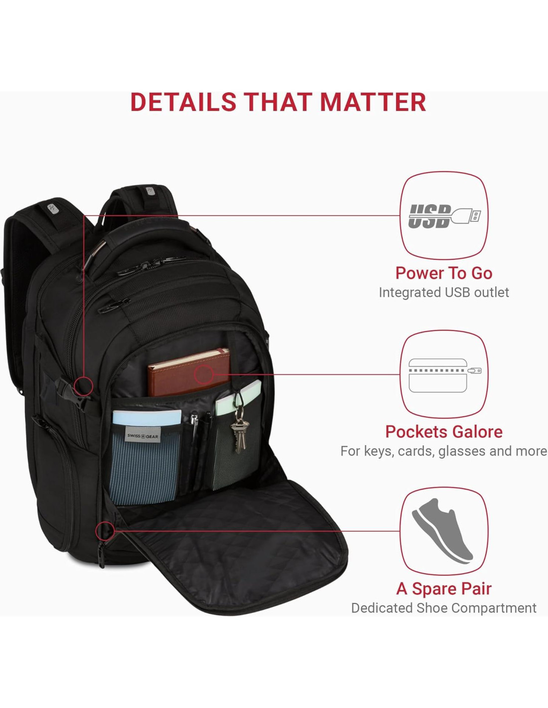 La mochila USB Travel Tech Elite 5358 de SwissGear está diseñada para viajeros modernos que necesitan un almacenamiento inteligente y organizado para sus dispositivos y esenciales. Diseñada con un compartimento ScanSmart amigable con TSA, acomoda laptops de hasta 16 pulgadas y tabletas de hasta 11 pulgadas, quedando plana para pasar sin problemas por la seguridad del aeropuerto. Un puerto USB incorporado ofrece carga conveniente en movimiento (banco de energía no incluido). Mantente organizado con múltiples compartimentos, incluyendo un área acolchada para laptop/tableta, bolsillos para accesorios de electrónica y bolígrafos, y un espacio dedicado para zapatos o equipo de gimnasio. Dos bolsillos para botellas de agua, bolsillos de acceso rápido en el exterior y correas de compresión mantienen todo seguro y al alcance. Para comodidad durante todo el día, la mochila cuenta con un panel trasero Airflow, correas de hombro acolchadas de malla y un asa superior reforzada con alambre para facilitar el levantamiento. Una correa para carrito permite apilarla sin esfuerzo sobre el equipaje rodante. Respaldada por una garantía de 10 años, esta mochila combina características tecnológicas inteligentes con la durabilidad confiable de SwissGear.