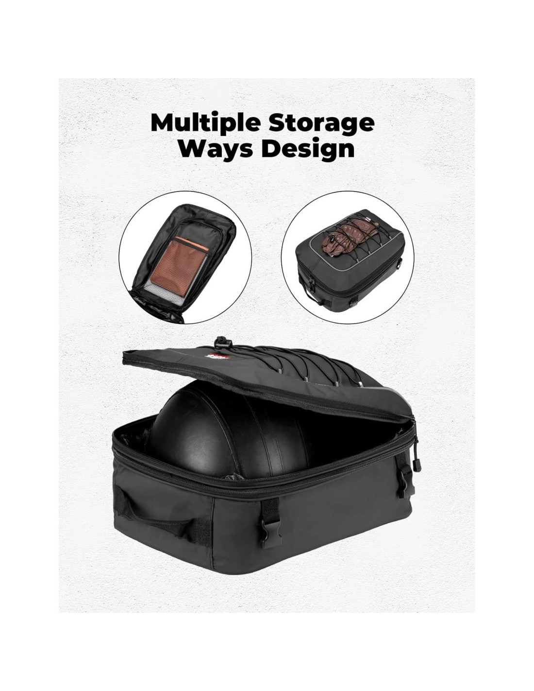 - Gran Capacidad de Almacenamiento: Nuestra bolsa de cola para motocicleta está diseñada con un compartimento inferior expandible de 22L-30L, lo que es conveniente para que almacenes más artículos. Ya sea un casco o equipo de conducción, puede proporcionar un amplio espacio de almacenamiento. También hay bolsillos de malla divididos dentro de la bolsa de cola, para que tus artículos puedan ser almacenados por categorías y fácilmente accesibles. Ya sea para el transporte diario o aventuras de larga distancia, esta bolsa de cola es tu compañero confiable.