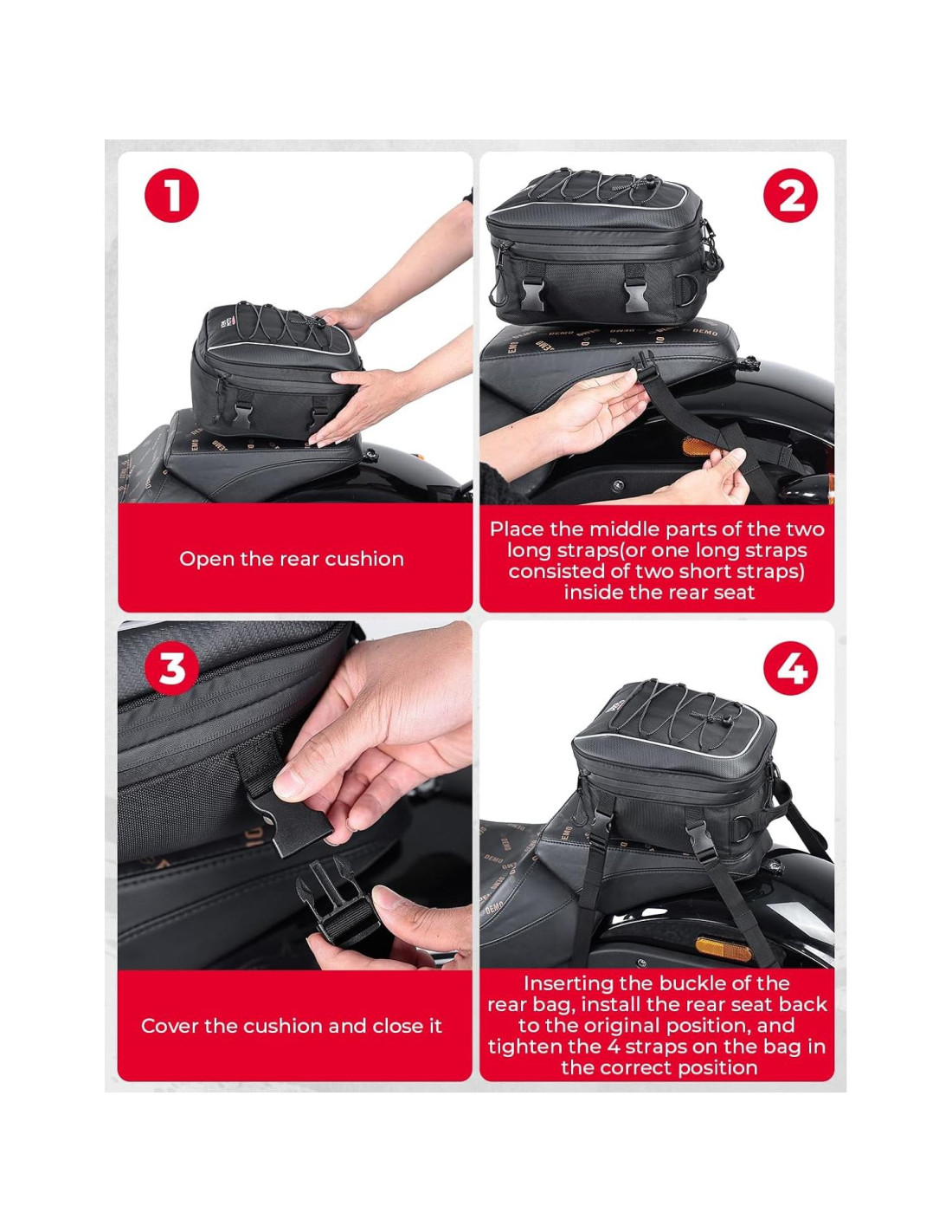 - Bolsa Estilosa Universal Fácil de instalar la bolsa de asiento de motocicleta en tu moto con correas. La mochila tiene un diseño universal y estiloso con franjas reflectantes. También es una decoración para tu motocicleta. Si tienes algún problema, ¡no dudes en contactarnos!
