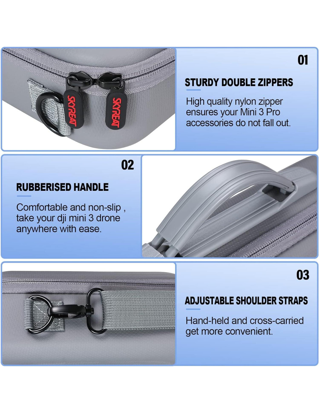 - Contenido del Paquete: 1 x Funda dura Mini 3 (Solo para Controlador Remoto RC), 1 x correa para el hombro, pero no incluye drone y accesorios.
