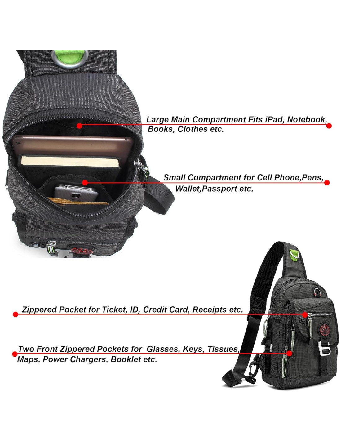 - Dimensiones: 8.3*3.9*11.8 pulgadas (21,08*9,91*29,97 cm). Se puede usar como mochila de pecho, bolso de hombro, bolso mensajero, bolso de viaje. Acomoda tanto a personas de talla regular como de talla grande.