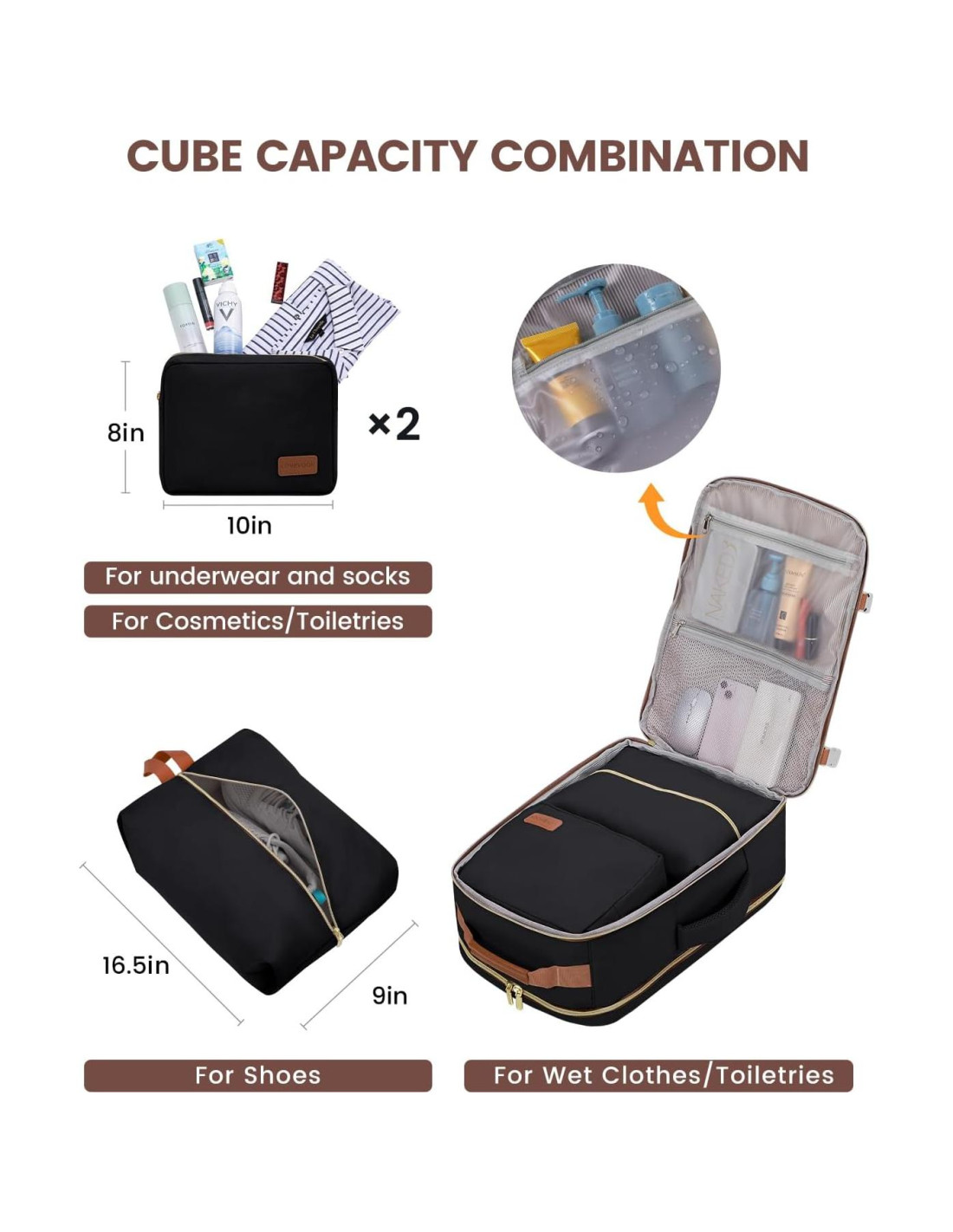 - [3 Cubos de Empaque Extra y Bolsillos Impermeables] Esta bolsa de mano incluye 3 cubos de empaque extra - 2 bolsas de almacenamiento y una bolsa para zapatos - así como un bolsillo de compartimento húmedo incorporado. Perfecto para almacenar ropa mojada, toallas y artículos de tocador, estos accesorios de empaque aseguran que tus pertenencias permanezcan secas y evitan que cualquier fuga o humedad afecte tus otros artículos.