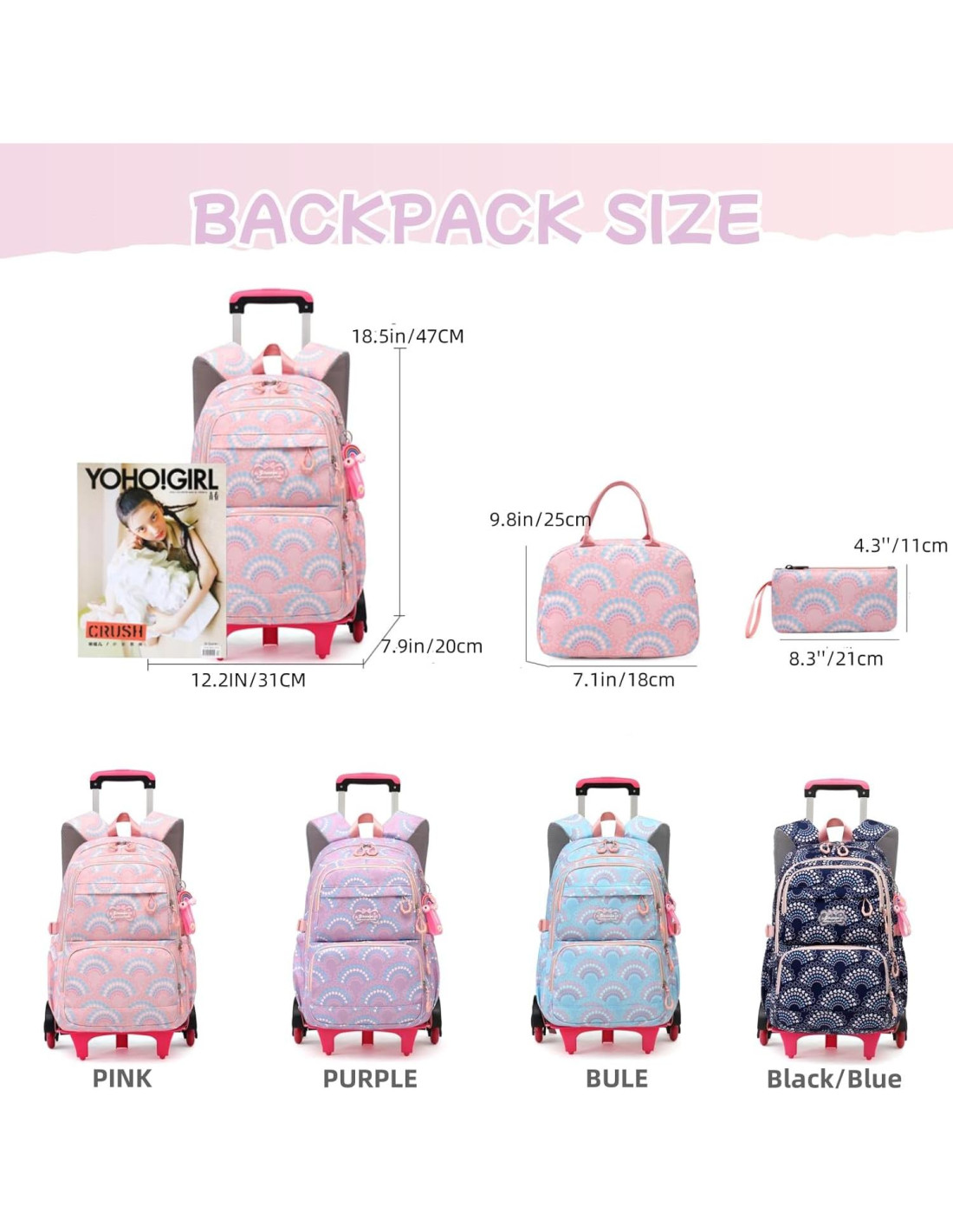 - Mochilas de trolley para niñas 3 en 1--Diseño de trolley desmontable, se puede usar solo como mochila, mochila de mano o junto con la barra de tiro. Una variedad de colores, cada color es cuidadosamente diseñado por el diseñador, a la moda, juvenil y enérgico, dando a los niños más opciones.