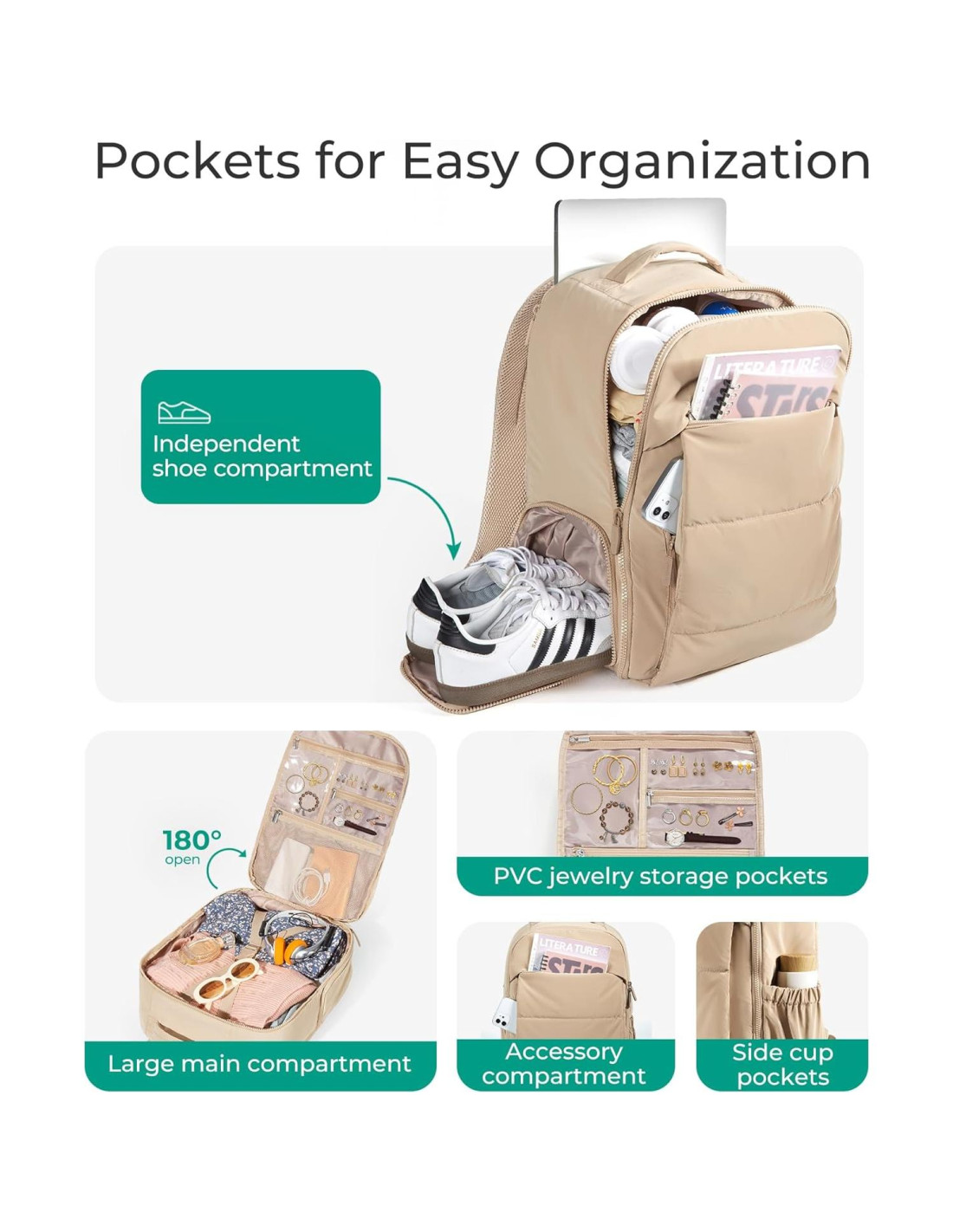 - Características Prácticas: Un compartimento separado para zapatos en el lado mantiene la limpieza y organización. El compartimento acolchado para portátiles de 15.6" (39.62 cm) hacia la parte trasera, mantiene los dispositivos electrónicos de fácil acceso y proporciona protección confiable contra impactos. Además, la correa trasera se ajusta convenientemente sobre el mango de una maleta para un transporte sin esfuerzo