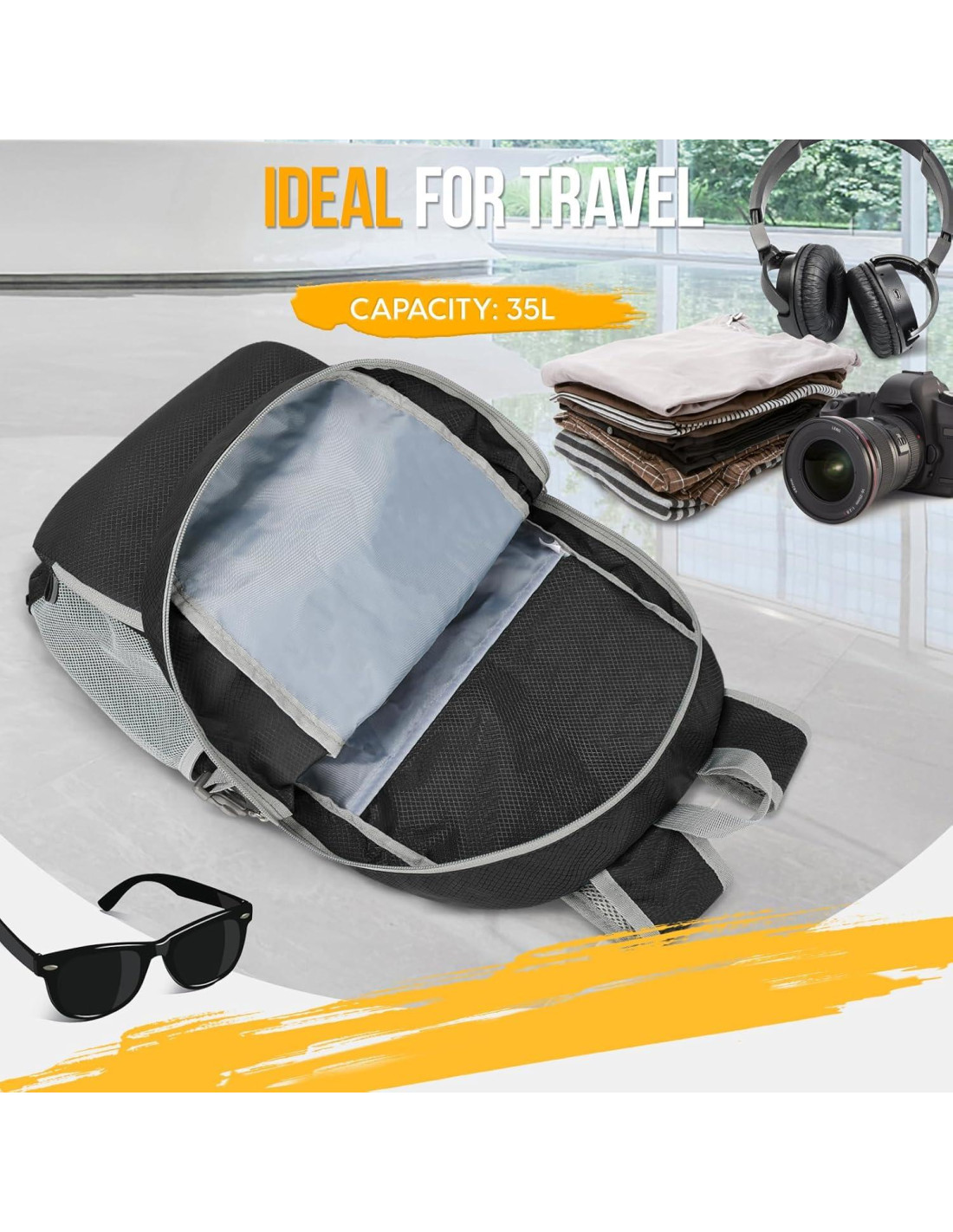 - Gran Capacidad Puede Plegar La Mochila Ligera 35L: Nuestra mochila plegable ligera tiene una capacidad de 35L, con gran capacidad y un diseño de bolsillo razonable. La mochila plegable ligera tiene 1 bolsa principal, 2 bolsas frontales y 2 bolsas laterales. Puedes acomodar los artículos que deseas llevar, como ropa, toallas de playa, botellas de agua, pasaportes y otras cosas que se pueden empacar. La mochila plegable ligera de 35L es como un cofre del tesoro. Satisface nuestras necesidades en todo momento.