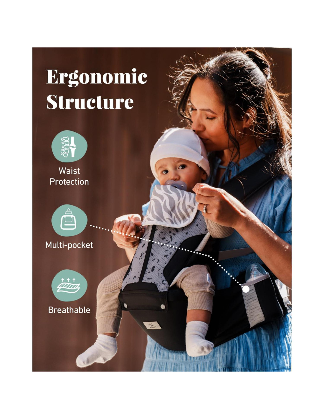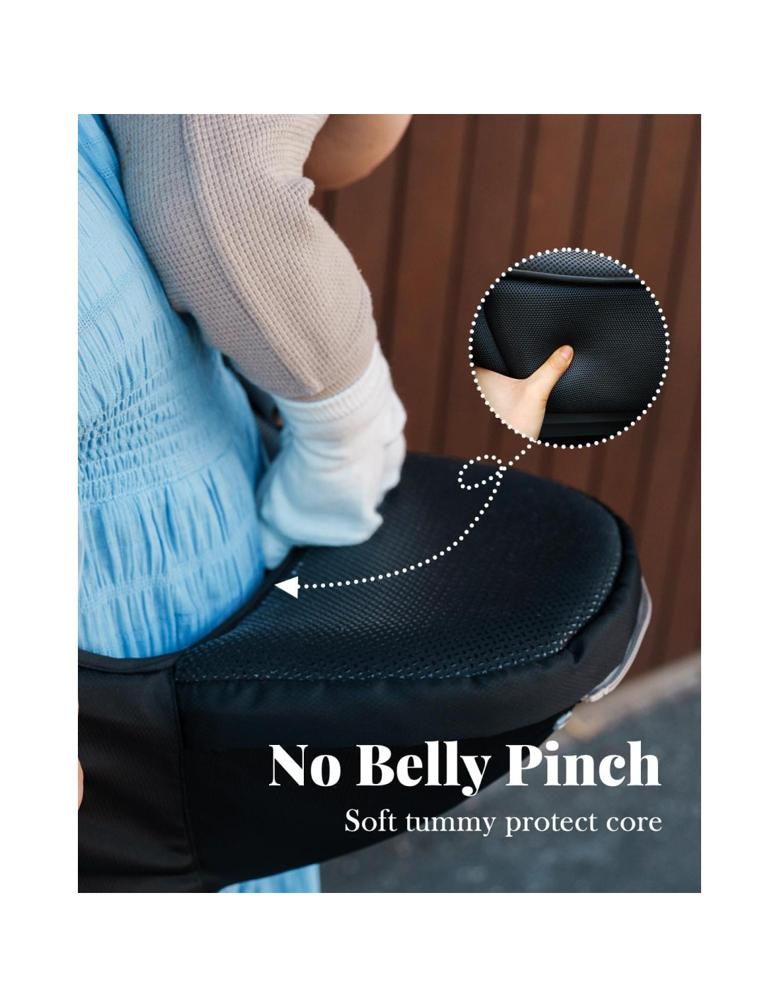 - Presentamos nuestro portabebés revolucionario. Diseñado con un núcleo protector suave para el abdomen, ofreciendo soporte suave sin ejercer presión en el área del abdomen. Pero eso no es todo: el asiento de cadera permite una distribución uniforme del peso del bebé, apoyando al bebé en una posición natural ergonómica "M" en todas las posiciones de carga.