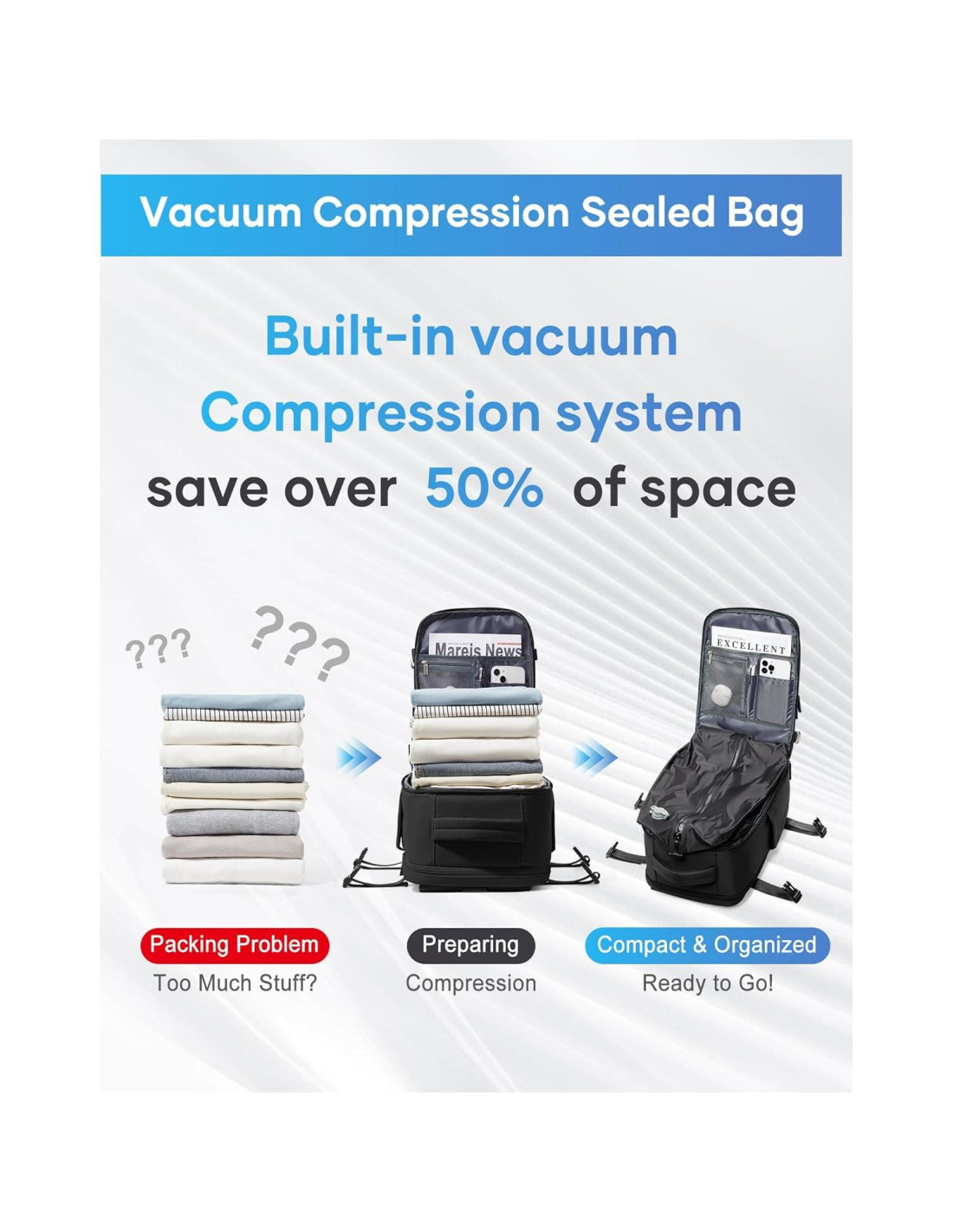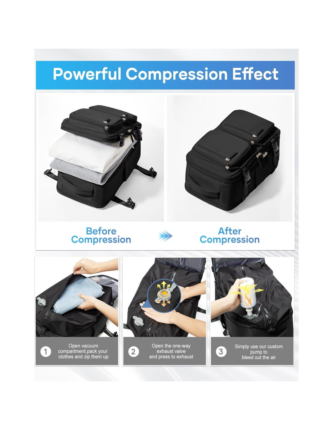 - Mochila versátil: Esta mochila de viaje sellada al vacío cuenta con un diseño impermeable con un bolsillo interno de compresión al vacío hermético hecho de tela TPU que es impermeable y resistente a olores, perfecta para almacenar zapatos o ropa sucia. Su aspecto elegante puede usarse como mochila universitaria, mochila de viaje, mochila para computadora, mochila de trabajo. El equipaje de mano aprobado por aerolíneas cabe en el compartimento superior y debajo de tu asiento, lo que la hace ideal para viajes de fin de semana, viajes de negocios y viajes.