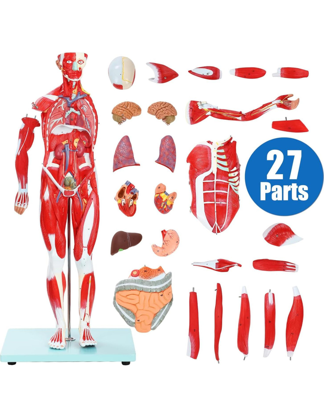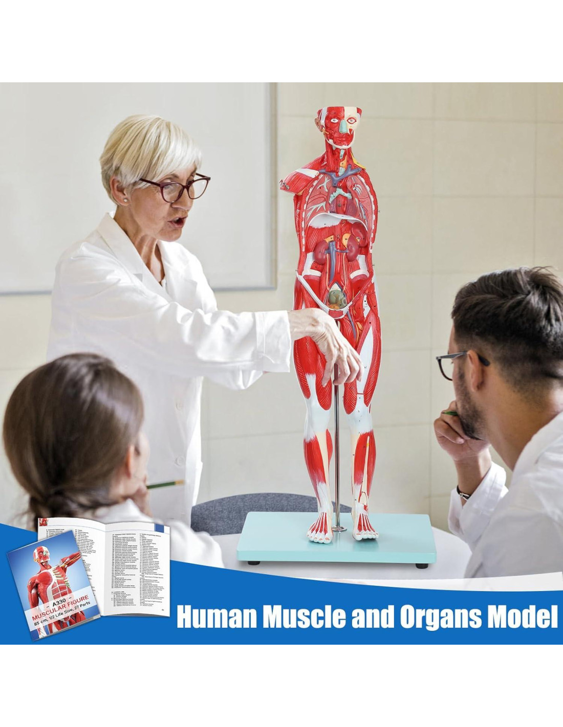 - Modelo Anatómico Muscular Preciso - Este es un modelo de músculo y órgano humano de 27 partes a escala 1/2, que incluye las siguientes partes desmontables: parte principal muscular, cráneo, cerebro (2 partes), pared torácica y abdominal, pulmón (2 partes), corazón (2 partes), hígado, estómago, intestinos con el páncreas, brazo derecho, brazo izquierdo con 4 músculos removibles (5 partes), músculos removibles de la pierna (9 partes), más de 350 marcas numeradas, cada estructura numerada puede ser identificada con precisión