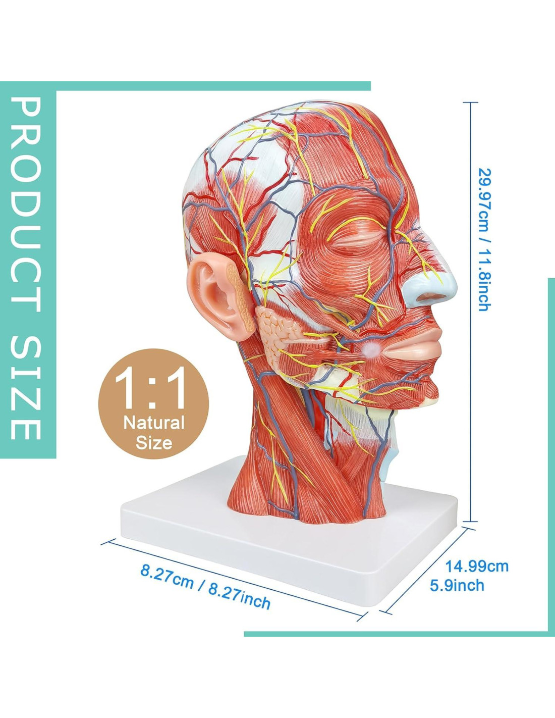 - Modelo Anatómico Superficial Neurovascular de Cabeza Humana a Tamaño Real. Este modelo de anatomía de cabeza humana a medio está diseñado para coincidir con el tamaño real de una cabeza humana, proporcionando una representación realista y detallada para un estudio anatómico completo. Perfecto para educación médica, investigación y uso profesional.