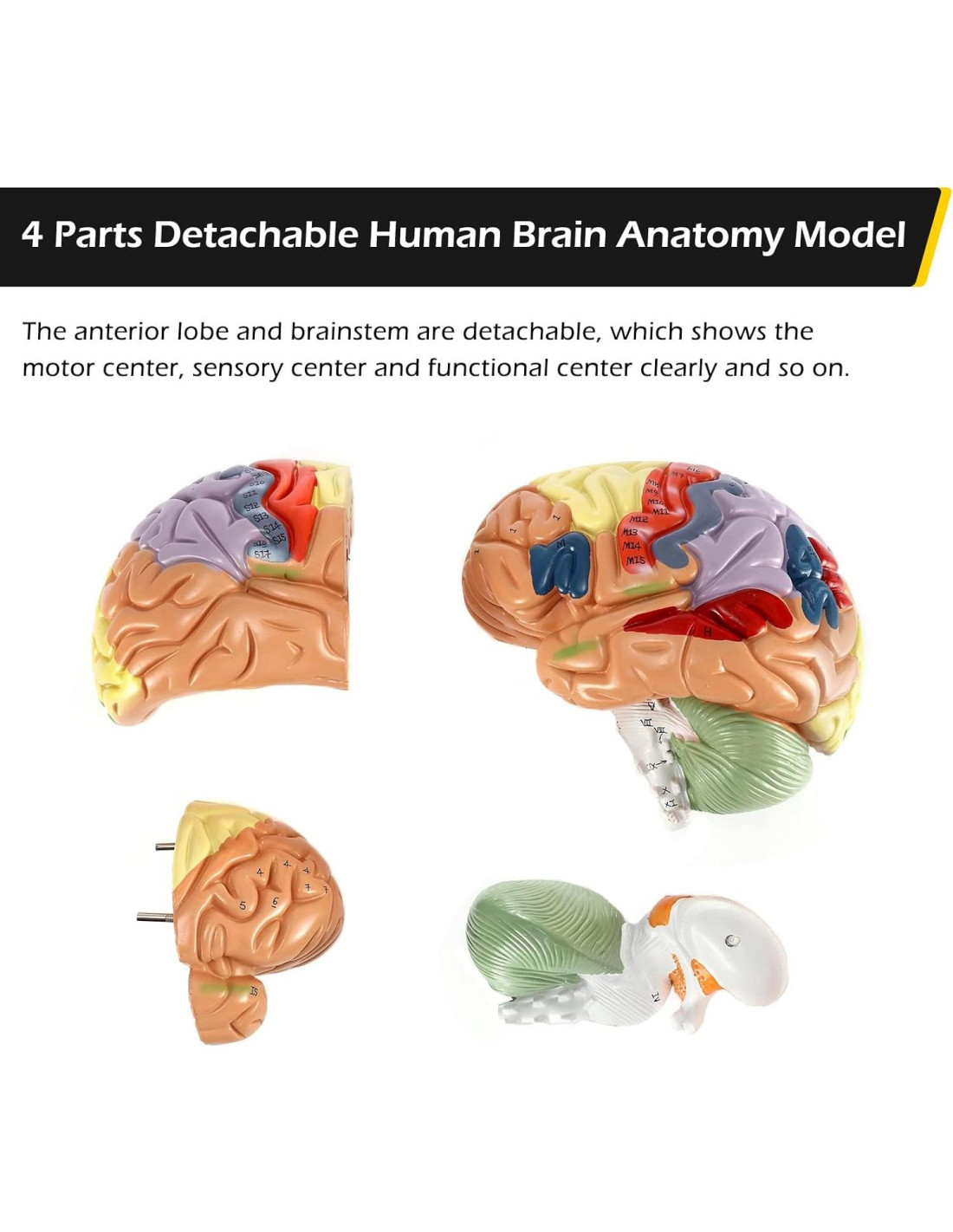 - Modelo Anatómico de Cerebro Humano 2X- El modelo anatómico del cerebro humano se puede dividir en 4 partes, el lóbulo anterior y el tronco encefálico son desmontables, lo que muestra claramente el centro motor, el centro sensorial y el centro funcional. Es una herramienta de investigación o enseñanza ideal para la anatomía del cerebro médico.