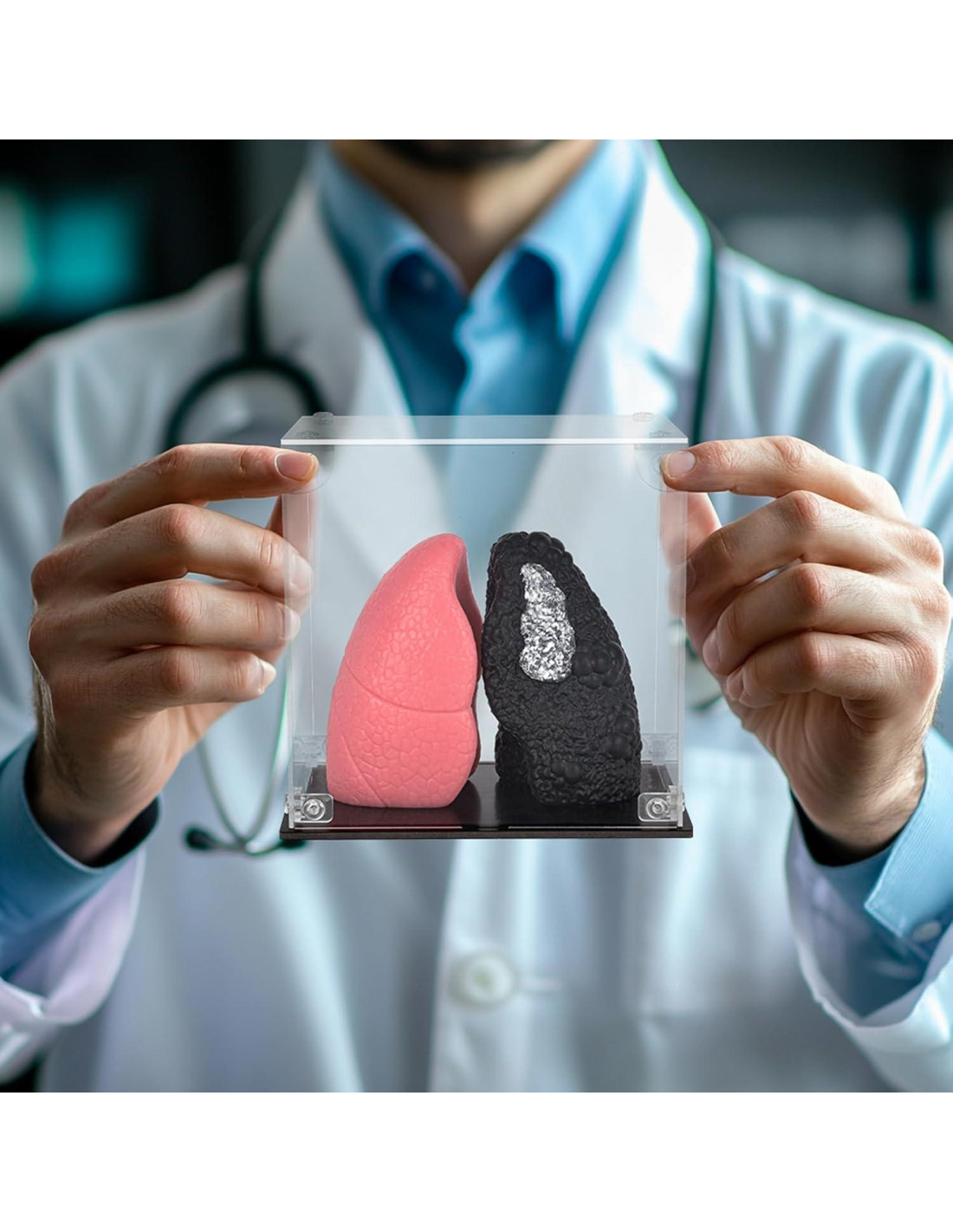 - Detalles Realistas: El modelo de comparación de pulmones presenta detalles meticulosamente elaborados e incluso distribución de color. El lado izquierdo, en negro, muestra el pulmón enfermo de un fumador, destacando condiciones como cáncer y enfisema. El lado derecho, en rosa, representa la estructura normal de un pulmón saludable. Cada detalle está replicado con precisión, proporcionando una experiencia visual y táctil realista.
