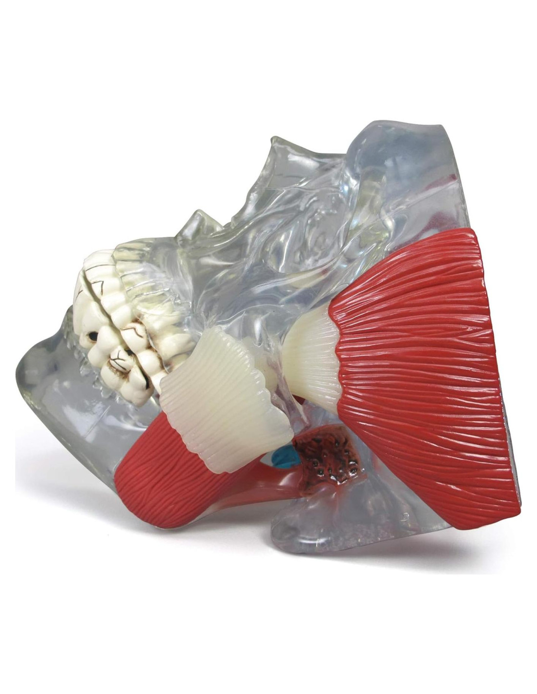 Modelo de Articulación Temporomandibular (ATM), que demuestra las condiciones problemáticas asociadas con la cápsula articular. Énfasis en el disco, inflamación del hueso circundante y también los efectos en los dientes, (grietas, astillas, caries y características del bruxismo). Modelo de dientes sobredimensionado de premolares y molares que presenta muchos problemas dentales comunes, algunos de los cuales son: absceso, periodontitis avanzada, caries, corona, deterioro, empaste, gingivitis, placa y pérdida ósea severa. Mandíbula de tamaño completo con bisagra y molde transparente para permitir la visualización de las raíces. El lado sano muestra una dentición y oclusión normales. El lado afectado muestra múltiples patologías, incluyendo: supererupción, absceso alveolar apical con caries, enfermedad periodontal, absceso lateral, abfracción, curvatura irregular de la raíz, canino impactado, erosión, diente fracturado, impacto horizontal, pulpitis radicular, conducto radicular con corona, reabsorción interna, atrición, reabsorción externa de la raíz, implantes y raíz fracturada.