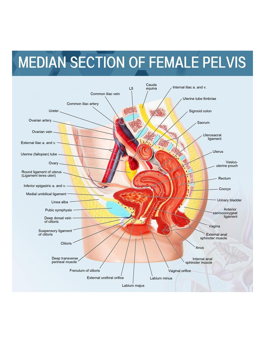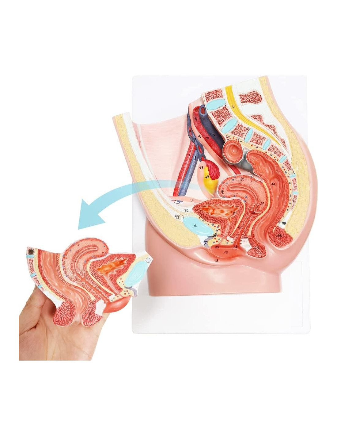 - Modelo de Pelvis Femenina Anatómica: El modelo de anatomía femenina Meriden muestra la mitad de los órganos genitales femeninos con vejiga y recto removible. Este modelo de anatomía a tamaño real presenta el sistema reproductivo femenino, el sistema urinario y la anatomía muscular. El modelo de pelvis femenina está numerado y pintado con vívidos detalles.