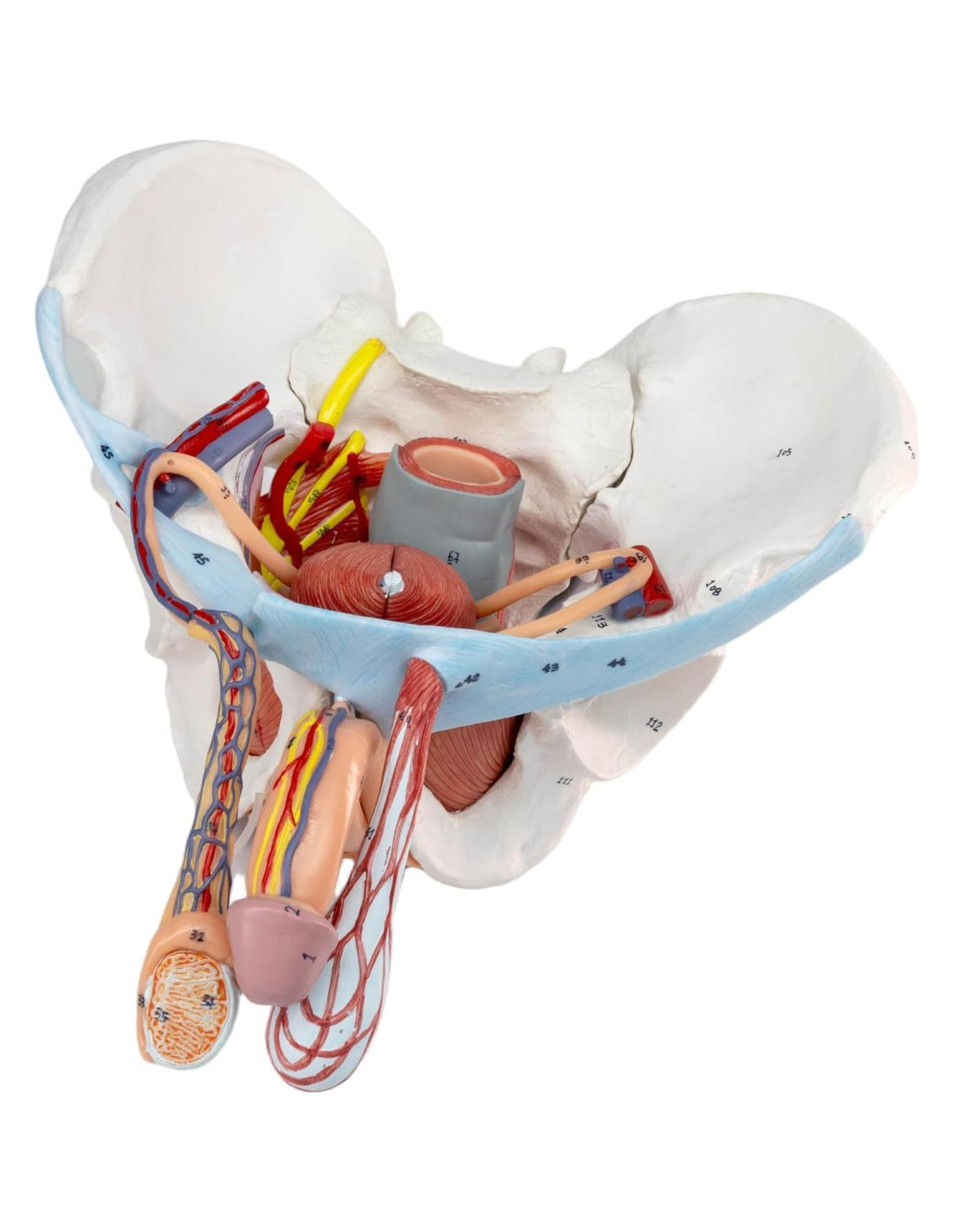 - Este es un modelo del suelo pélvico masculino humano a tamaño real de 11 partes que incluye las siguientes partes desmontables: huesos, ligamentos, vasos, nervios, músculos del suelo pélvico y órganos sexuales externos.