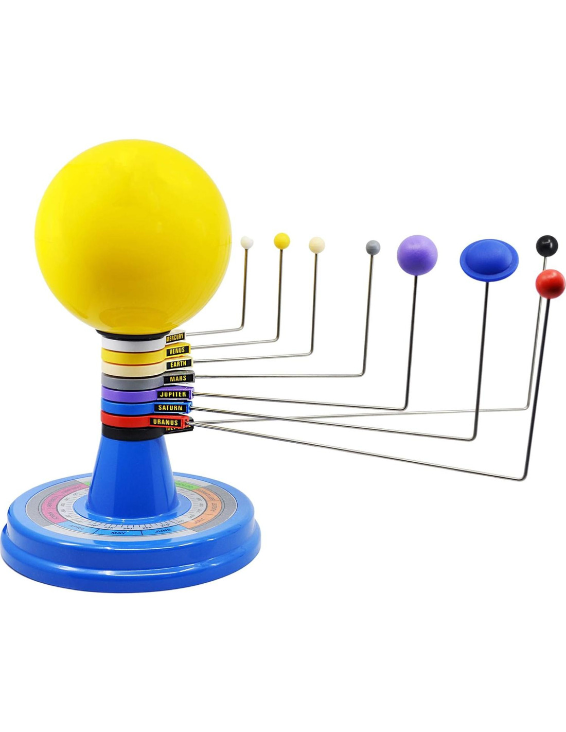 Este modelo tridimensional permite a los estudiantes estudiar nuestro sistema solar - observando los tamaños y colores relativos de los planetas. Demuestra por qué los planetas son a veces visibles en el cielo nocturno y a veces no lo son. El modelo cuenta con un sol de 15 cm en el centro, y tiene ocho planetas situados en barras de metal que se pueden mover manualmente alrededor del sol para mostrar posiciones relativas en varios momentos durante el año. La base resistente presenta un gráfico que etiqueta cada mes y la ubicación en grados.