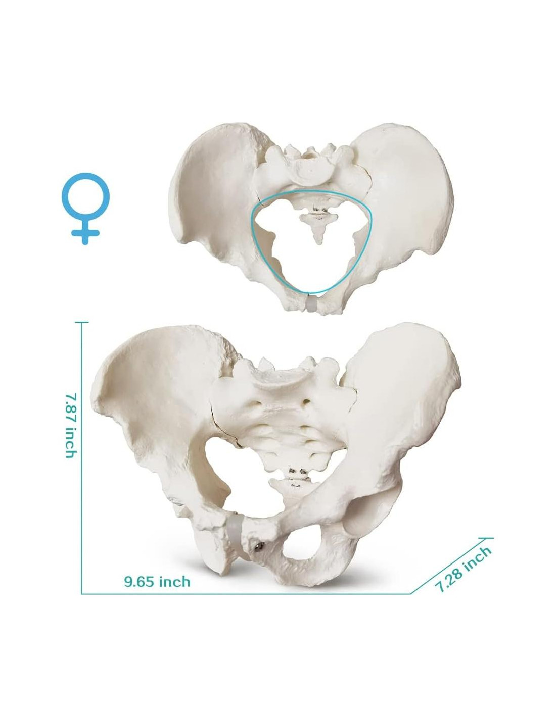 - Este esqueleto de pelvis fue desarrollado por profesionales médicos y moldeado a partir de un esqueleto humano original, incluyendo los innominados izquierdo y derecho (huesos de la cadera), huesos pélvicos (isquion, ilion y pubis), sacro, cóccix y sínfisis púbica, acetábulo y foramen obturador; Incluye 'cartílago' en la sínfisis púbica para un detalle preciso y realista.
