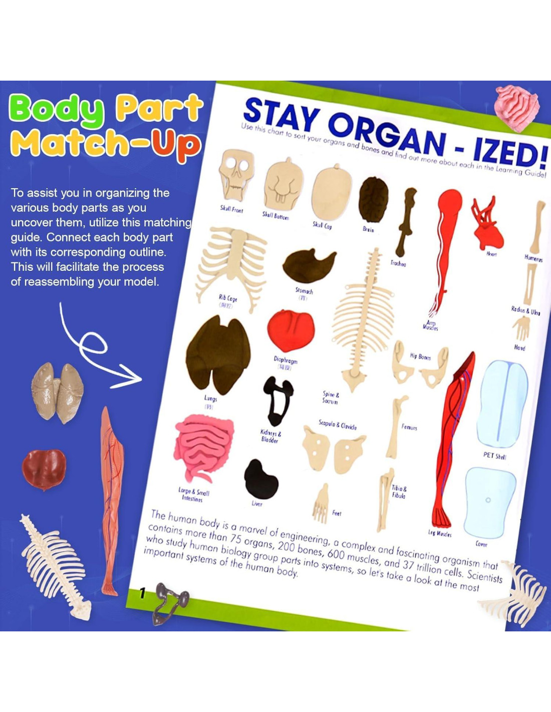 - Kit de Cuerpo Humano de 32 Piezas: Este kit de cuerpo humano de 32 partes incluye un caparazón corporal de 9" (22.9 cm), soporte de exhibición, pinzas, organización y una guía de estudio completa llena de información anatómica.