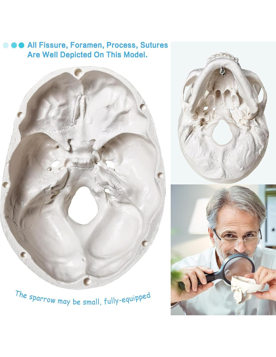 - Modelo de Cráneo Pequeño con Cerebro: 1:2 modelo de cráneo pequeño exquisito, diseñado por un grabador 3D y profesor de escuela de medicina. La parte de la cabeza se puede abrir para observar la estructura interna del cráneo. La mandíbula está conectada por un resorte, lo que puede simular movimientos de mordida normales. Tiene una fuerte base científica y artística.