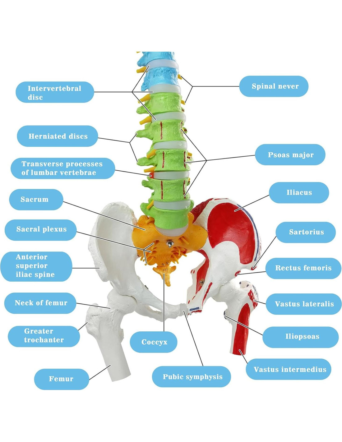 - Modelo de Anatomía de Columna Vertebral Humana de Tamaño Real - Este modelo flexible de columna vertebral humana tiene diferentes estructuras óseas pintadas en diferentes colores. Puede simular y demostrar la dinámica de flexión del modelo anatómico de columna vertebral. Incluye el hueso occipital, 24 vértebras, sacro, cóccix, huesos de la cadera izquierda y derecha, hueso púbico y cabezas de muslo izquierda y derecha, los huesos de la cadera izquierda y derecha, el muslo y el hueso púbico se pueden desmontar.