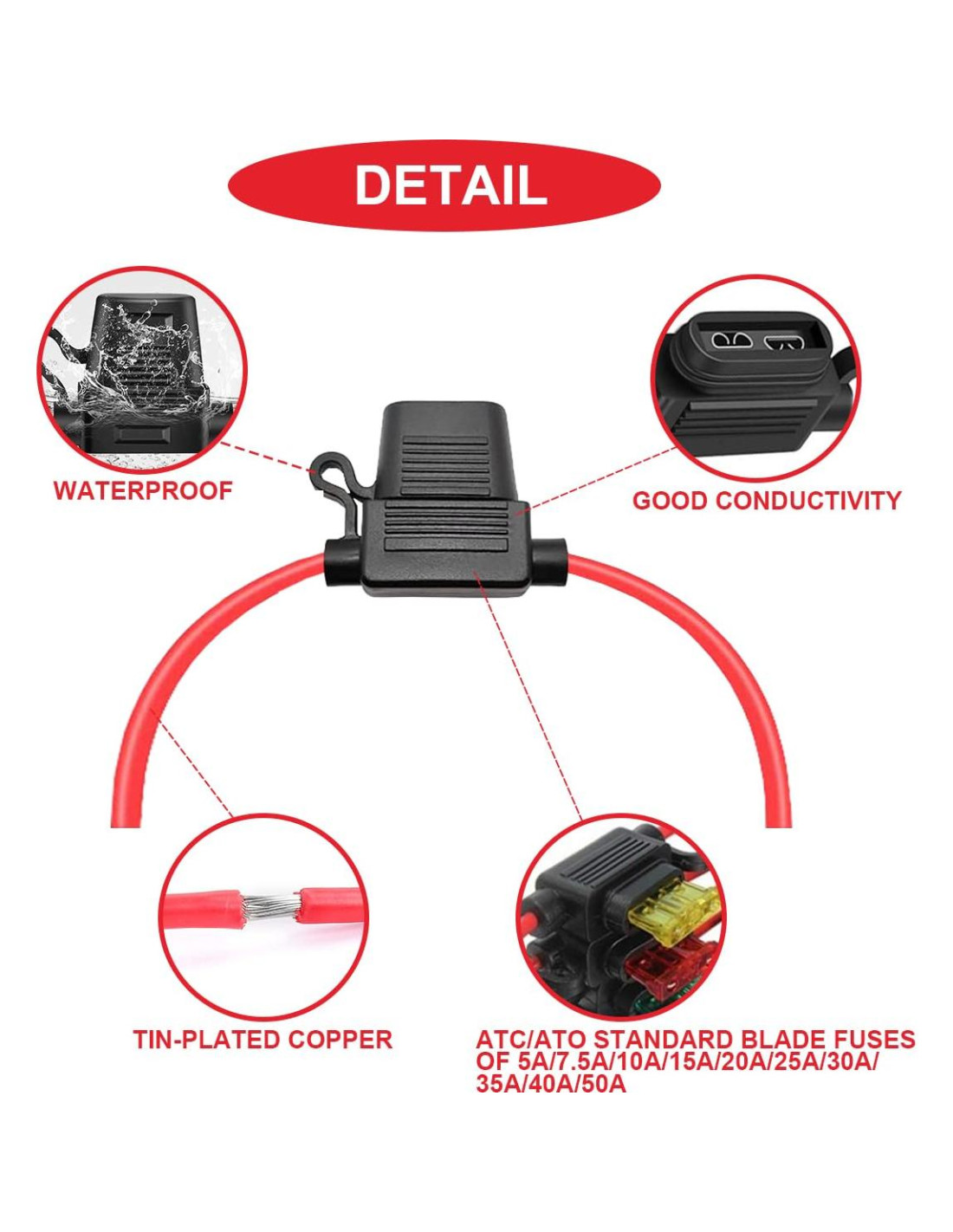 - CONTENIDO DEL PAQUETE. 6 x Soportes de Fusibles Inline 12 AWG, 60 x fusibles de cuchilla estándar (6 cada uno para 5A, 7.5A, 10A, 15A, 20A, 25A, 30A, 35A, 40A, 50A), 5 x Conector de Manguito Termocontraíble, 1 x Extractor de Fusibles.