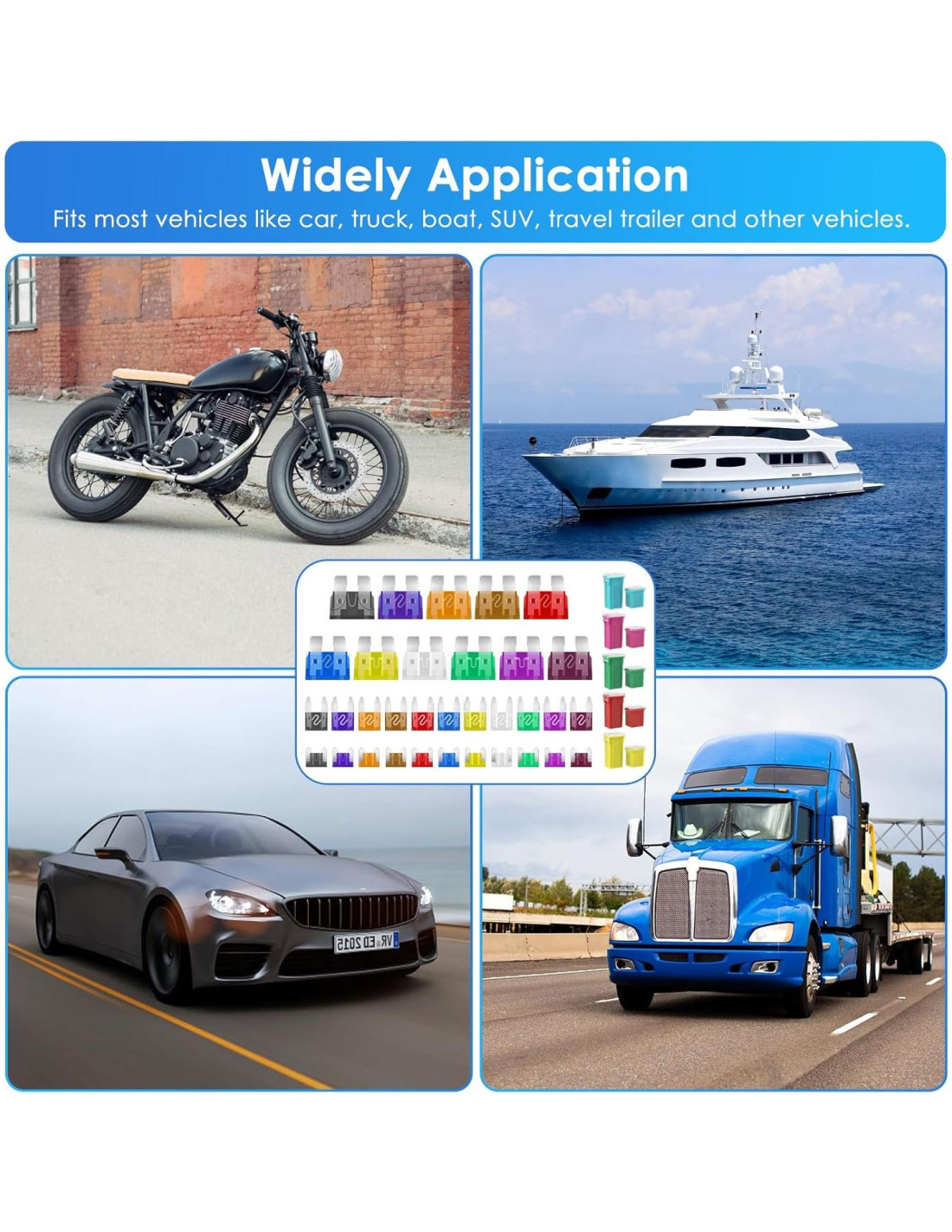 - USO AMPLIO-Estos kits de surtido de fusibles de reemplazo automotrices con un extractor están diseñados específicamente para Coches, Camiones, SUV, Vehículos, ATV, UTV, Caravanas RV, Motocicletas, Flotas, Carros de Golf, Barcos, Motonieves y la mayoría de las aplicaciones generales de CC, cubriendo componentes como radio, luces, intermitentes, etc. Este conjunto de fusibles es imprescindible para un viaje por carretera