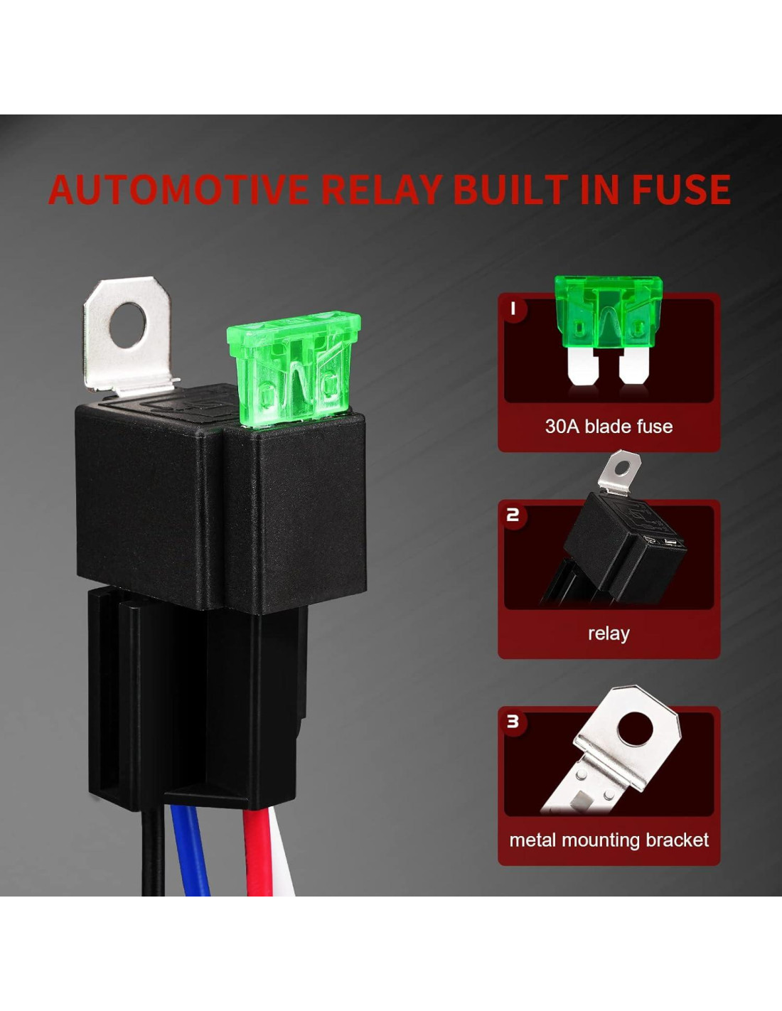 - Contenido del Paquete: Cada relé de 4 pines tiene un fusible de cuchilla de 30A y viene con un soporte de montaje de metal y un conector de 4 cables.