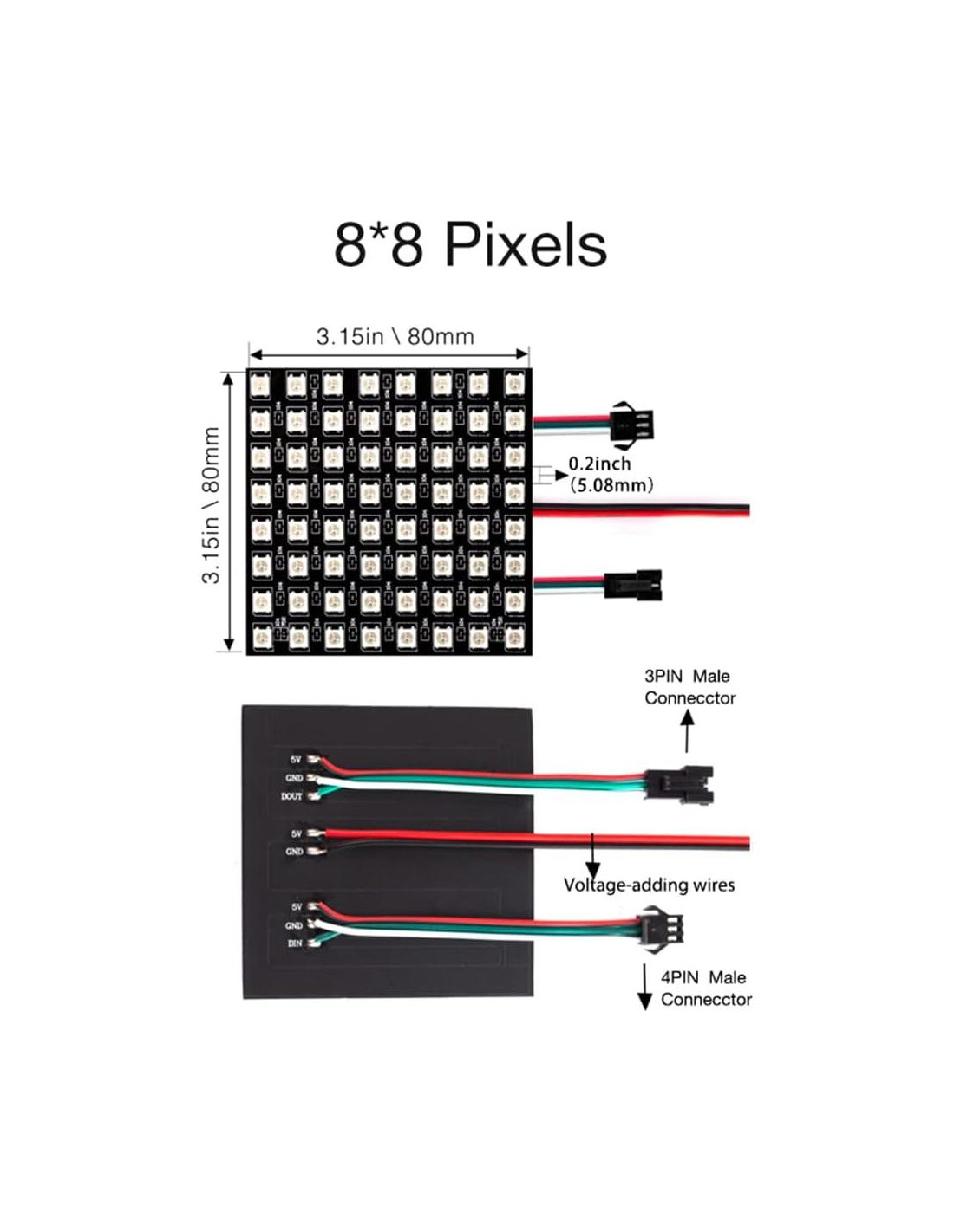 - El voltaje de funcionamiento de la matriz WS2812B es DC5V. Por favor, no uses una fuente de alimentación de DC12V o DC24V. (fuente de alimentación y controlador no incluidos) un voltaje superior a DC5V lo destruirá