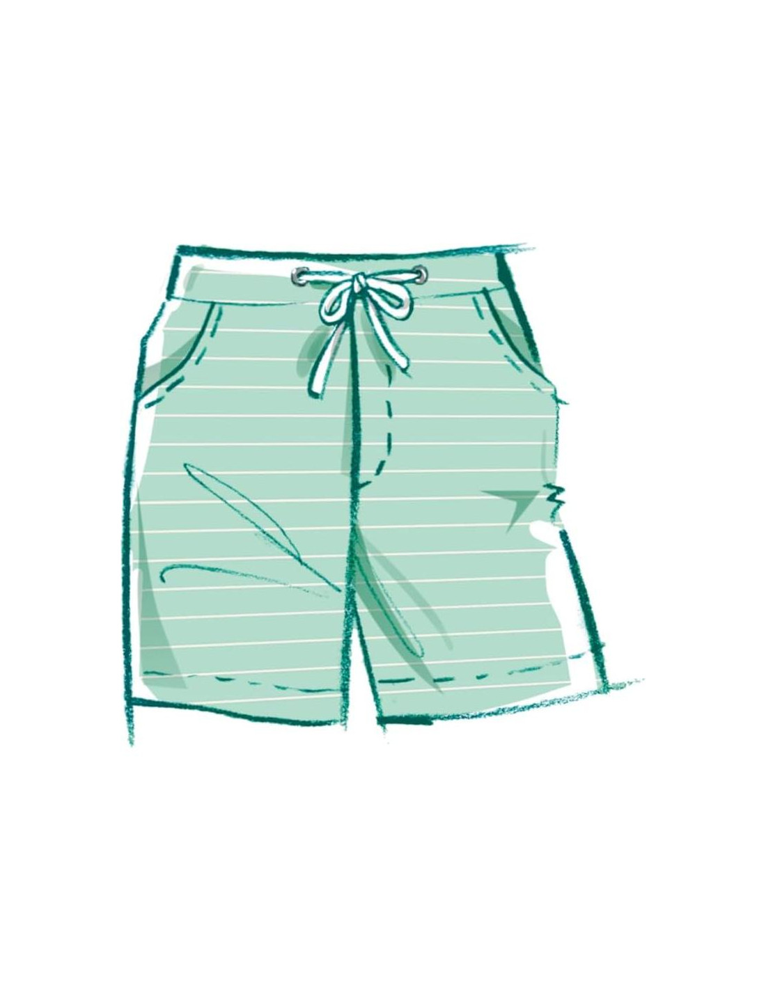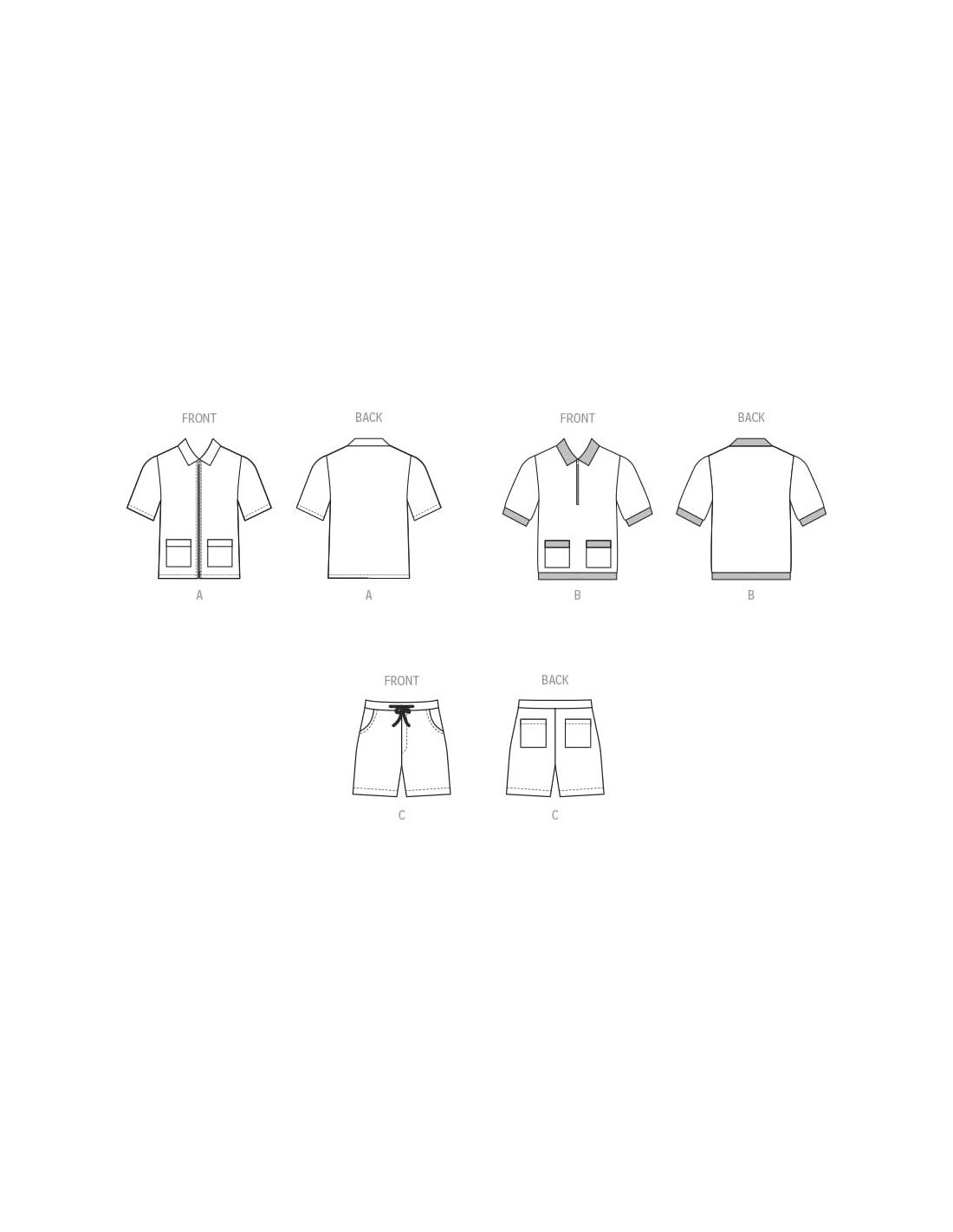 - Las camisas de punto con cremallera expuesta tienen cuello, mangas cortas y bolsillos frontales con bandas; la vista A tiene una cremallera separadora; la camisa de la vista B tiene cuello y bandas de contraste; los pantalones cortos con cintura elástica y cordón tienen bolsillos y dobladillo cosido