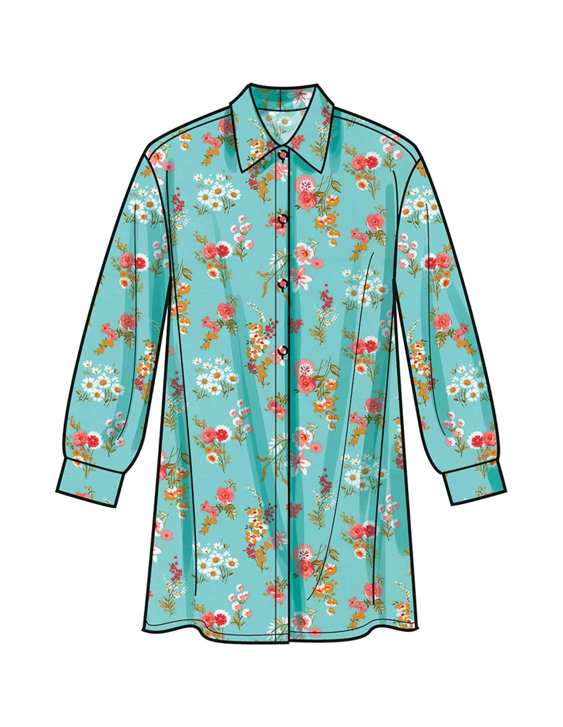 - Patrones de costura de camisas de ajuste relajado con botones en la parte delantera en dos longitudes presentan yugo, cuello y puños abotonados; las vistas A y C tienen bolsillos en las costuras laterales