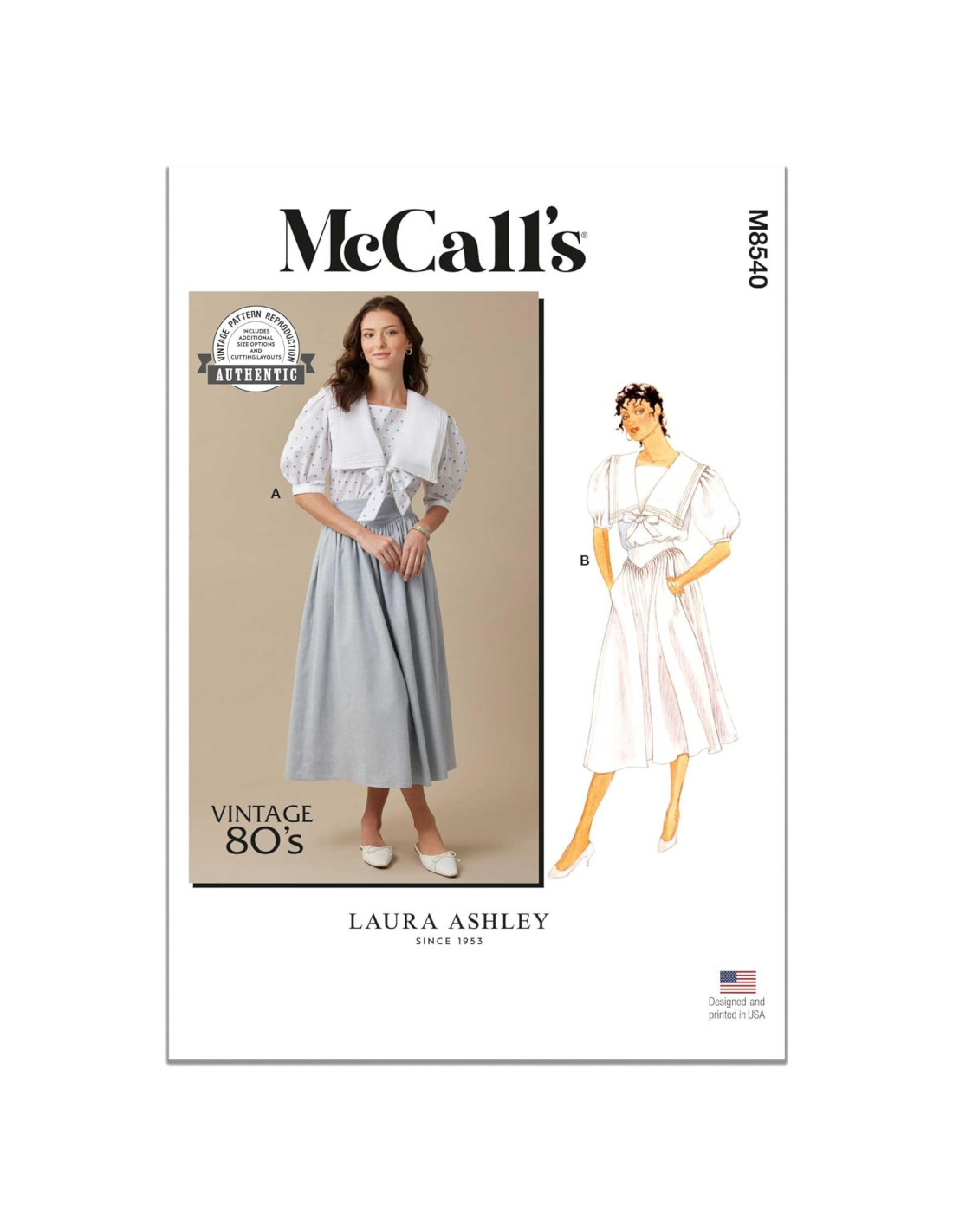 Patrón de costura vintage de top y falda de los años 1980 de McCall's y Laura Ashley. El top de pullover A o B tiene cuello de marinero con pliegues, dickey y corbata; mangas de longitud por encima del codo con capucha plisada están plisadas a bandas. El top A tiene cuello y bandas de mangas en contraste. La falda completa y recogida tiene una cinturilla con forma y botones, bolsillos en las costuras laterales frontales, cierre de cremallera en la parte posterior. La reproducción vintage auténtica incluye tamaños adicionales y disposiciones de corte. Challis, algodón, mezclas de algodón, damasco, crepé de lana ligera, seersucker, sarga de seda. Cuello y bandas de mangas en contraste solo en telas de colores sólidos. Todas las vistas: no apto para diagonales. Entretela: fusible ligera. Los kits de patrones de McCall's vienen con piezas de patrón para cortar la tela, instrucciones escritas e ilustradas paso a paso para guiarte a través del proceso de costura, información sobre cómo seleccionar telas y adornos, y información sobre tallas. Estos patrones de ropa se pueden hacer para adaptarse a las tallas de misses 6-8-10-12-14. Diseñado y fabricado con orgullo en los Estados Unidos de América. Código de diseño M8540