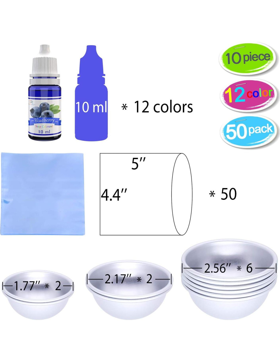 - TODO EN UNO - 3 tamaños 10 piezas moldes para bombas de baño y 12 colores de tinte para jabón pueden hacer bombas de baño vibrantes y encantadoras de diferentes tamaños. 50 bolsas de envoltura shrink para bombas de baño pueden dar a tus creaciones una protección segura. ¡Perfecto set de suministros para hacer bombas de baño DIY!
