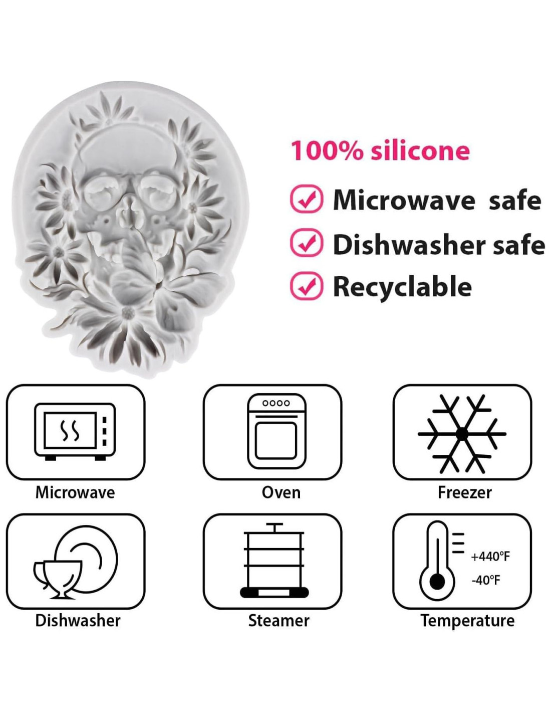 - [Material Seguro]: moldes de fondant de calavera 100% grado alimenticio. Moldes de Fondant de Cabeza de Esqueleto son de diseño suave, se liberan fácilmente después de un giro suave. Las formas de los Moldes de Fondant de Cabeza de Esqueleto salieron tan fácilmente, también es fácil de lavar. Este conjunto de Moldes de Fondant de Calavera se puede usar de manera segura en hornos, microondas y congeladores. El molde de chocolate de calavera tiene un rango de temperatura resistente al calor de -40 a 220 grados Celsius/-40 a 445 F