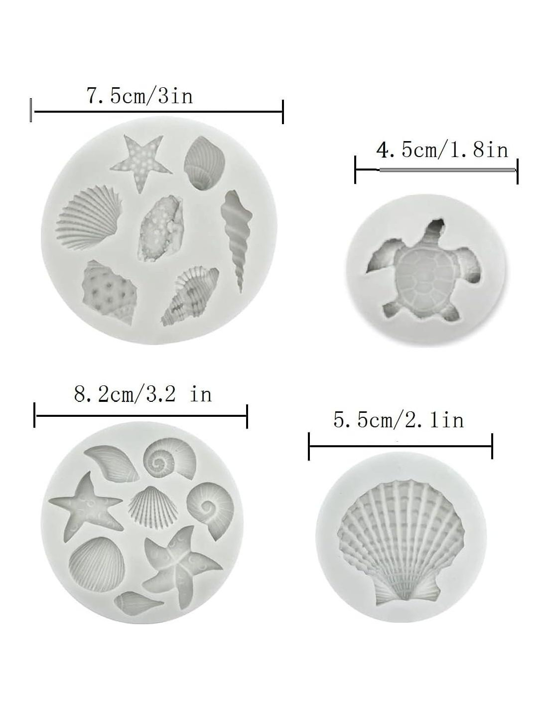 - Moldes de Silicona para Fondant de Tema Marino - Material: silicona de grado alimenticio. Adaptado a temperaturas extremas: -40 grados a 230 grados. Paquete: 1 Molde de Silicona de Concha, 1 Molde de Silicona de Concha, 1 Molde de Silicona de Estrella de Mar, 1 Molde de Silicona de Tortuga Marina